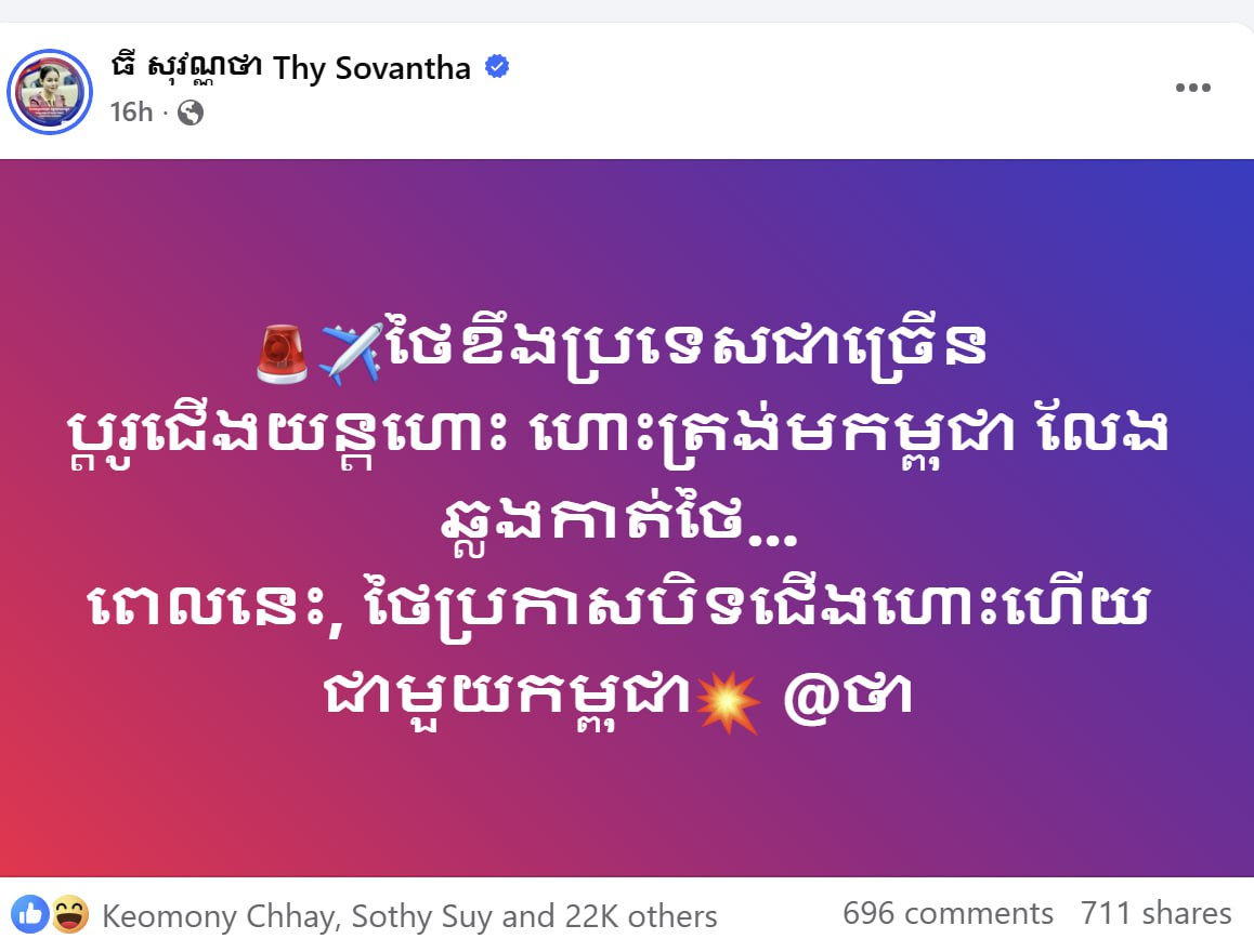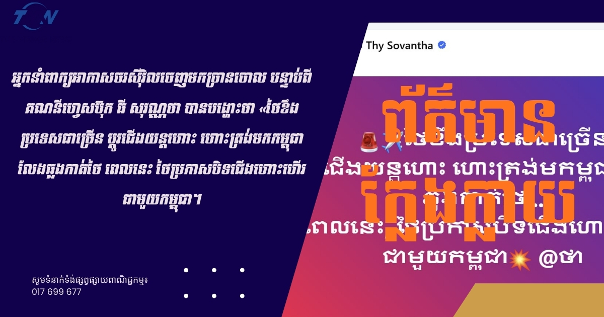 អ្នកនាំពាក្យអាកាសចរស៊ីវិលចេញមកច្រានចោល បន្ទាប់ពីគណនីហ្វេសប៊ុក ធី សុវណ្ណថា បានបង្ហោះថា «ថៃខឹងប្រទេសជាច្រើន ប្តូរជើងយន្តហោះ ហោះត្រង់មកកម្ពុជា លែងឆ្លងកាត់ថៃ ពេលនេះ ថៃប្រកាសបិទជើងហោះហើរជាមួយកម្ពុជា