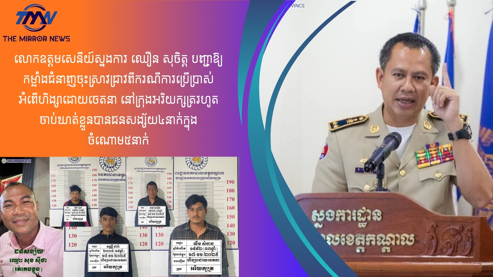 លោកឧត្ដមសេនីយ៍ស្នងការ ឈឿន សុចិត្ត បញ្ជាឱ្យកម្លាំងជំនាញចុះស្រាវជ្រាវពីករណីការប្រើប្រាស់អំពើហិង្សាដោយចេតនា នៅក្រុងអរិយក្សត្ររហូតចាប់ឃាត់ខ្លួនបានជនសង្ស័យ៤នាក់ក្នុងចំណោម៥នាក់
