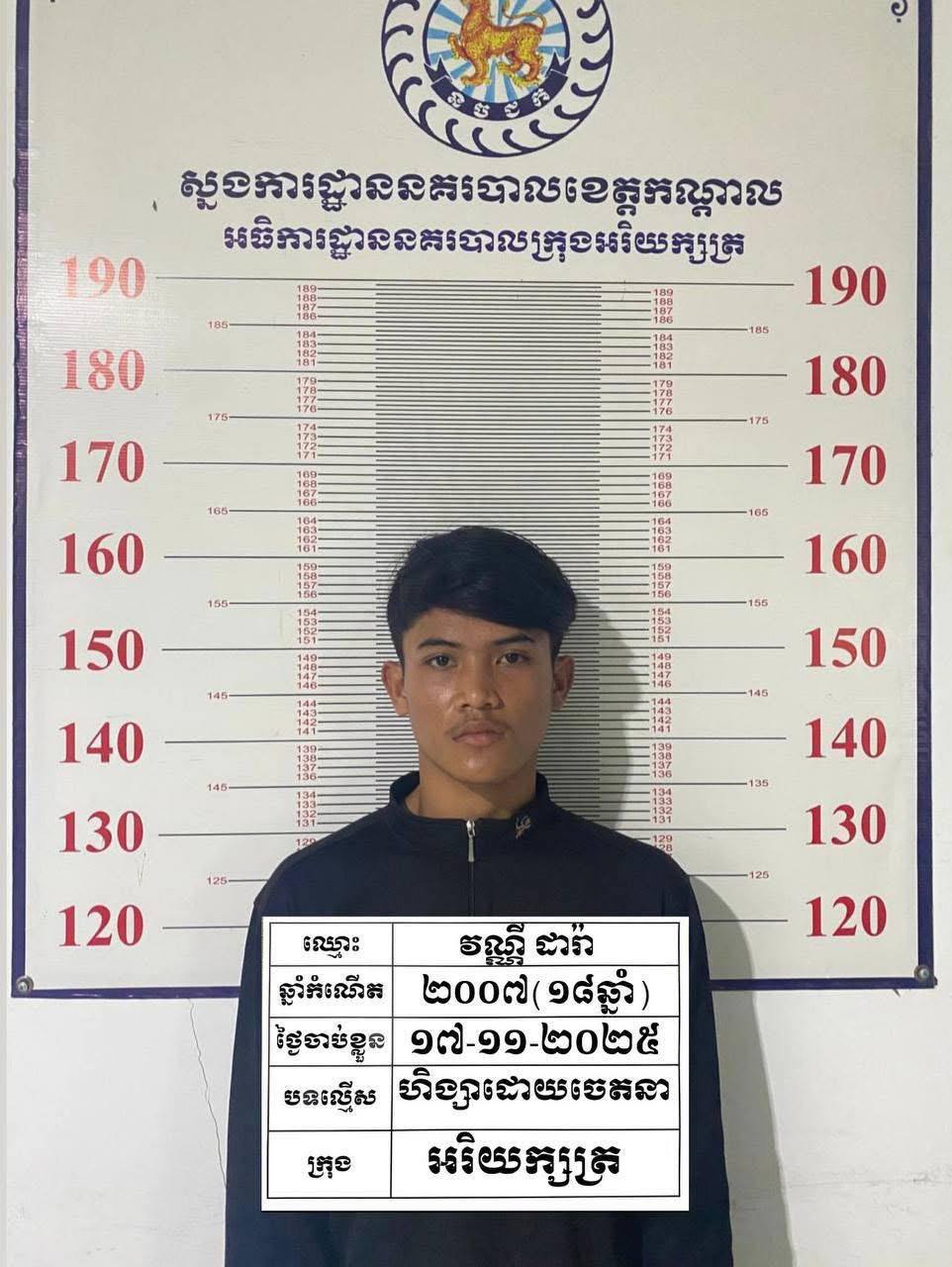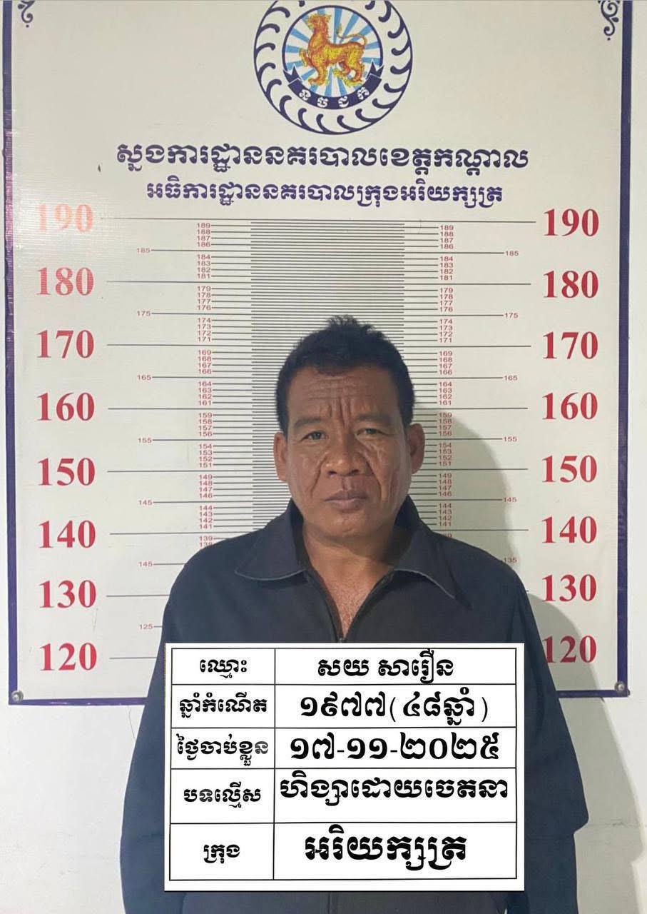 ដោយអនុវត្តតាមការដឹកនាំបញ្ជាដ៏ខ្ពង់ខ្ពស់របស់ ឯកឧត្តមនាយឧត្តមសេនីយ៍ អគ្គស្នងការនគរបាលជាតិ និងឯកឧត្តម គួច ចំរើន អភិបាល នៃគណៈអភិបាលខេត្តកណ្តាល លោកឧត្តមសេនីយ៍ទោ ឈឿន សុចិត្ត ស្នងការនគរបាលខេត្តកណ្តាល បានបញ្ជាឱ្យលោកអធិការនគរបាលក្រុងអរិយក្សត្រ ស្រាវជ្រាវបំភ្លឺពាក់ព័ន្ធករណីខាងលើ ជាលទ្ធផល៖ មានករណីហិង្សាដោយចេតនាបានកើតឡើងកាលពីថ្ងៃទី១៧ ខែវិច្ឆិកា ឆ្នាំ២០២៥ វេលាម៉ោង០៩៖០០នាទីនៅចំណុច ភូមិព្រែកតាកូវ សង្កាត់ព្រែកតាកូវ ក្រុងអរិយក្សត្រ ខេត្ដកណ្ដាល ដោយជនរងគ្រោះ ចំនួន០២នាក់៖ ១.ឈ្មោះ ជឹម ធឿន ភេទប្រុស អាយុ៦១ឆ្នាំ ជនជាតិខ្មែរ មុខរបរកសិករ មានទីលំនៅបច្ចុប្បន្នភូមិព្រែកតាកូវ សង្កាត់ព្រែកតាកូវ ក្រុងអរិយក្សត្រ ខេត្ដកណ្ដាលបានរងរបួសហូរឈាមក្រោមសាច់ដុំដៃខាងឆ្វេងនិង