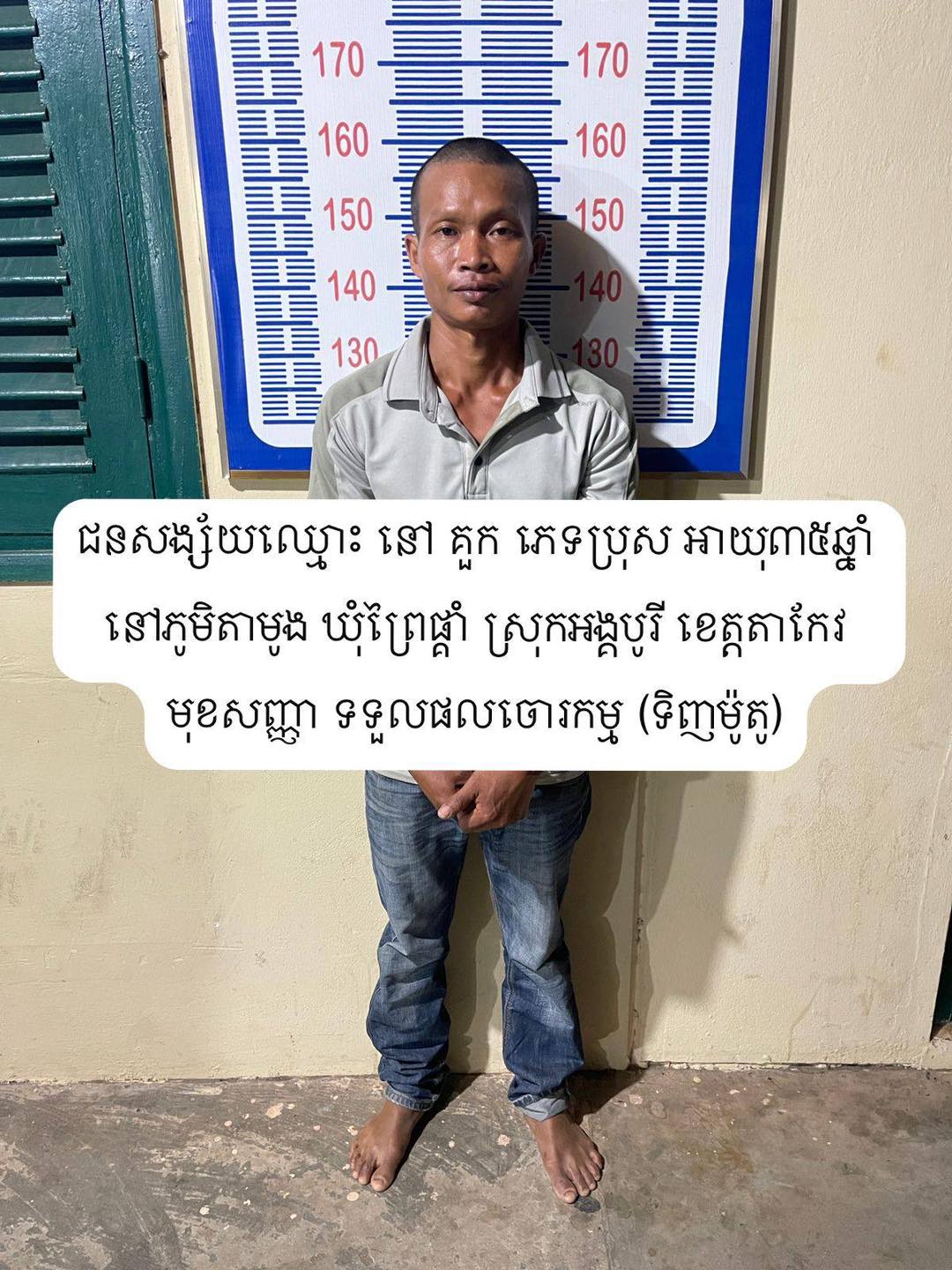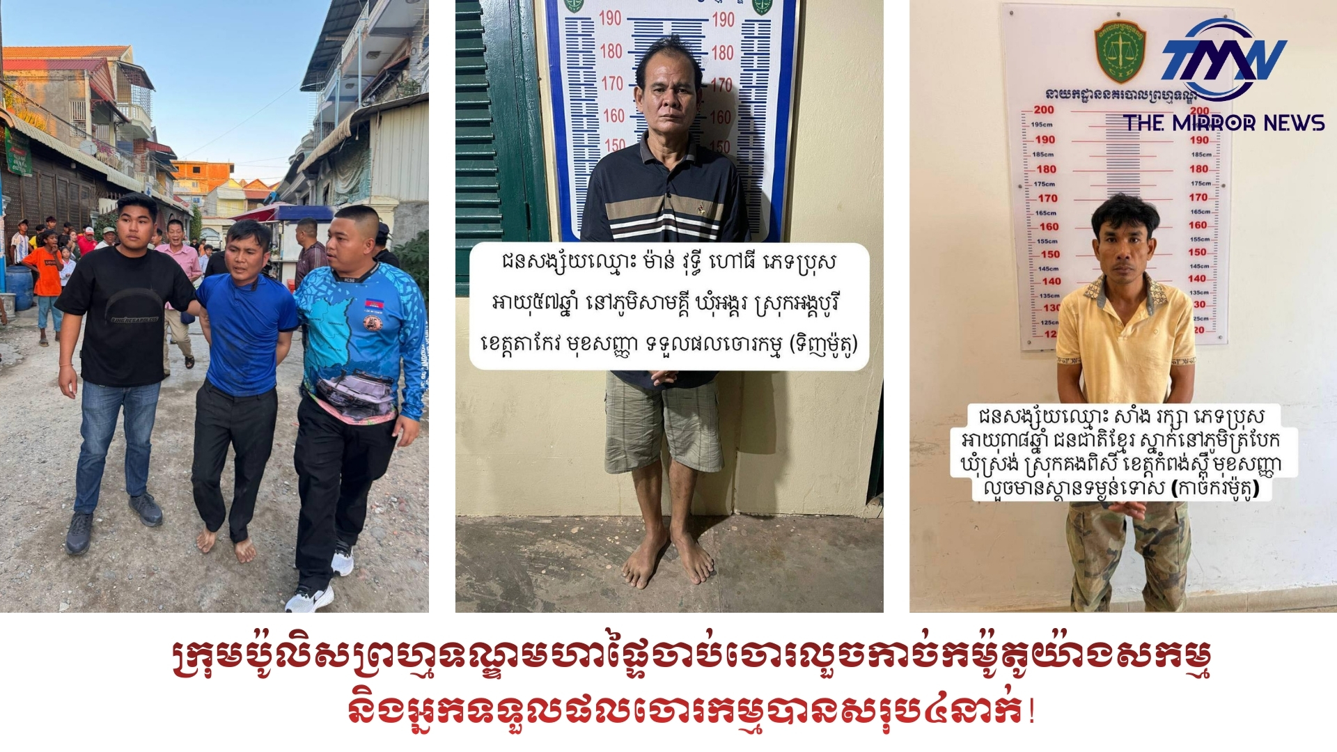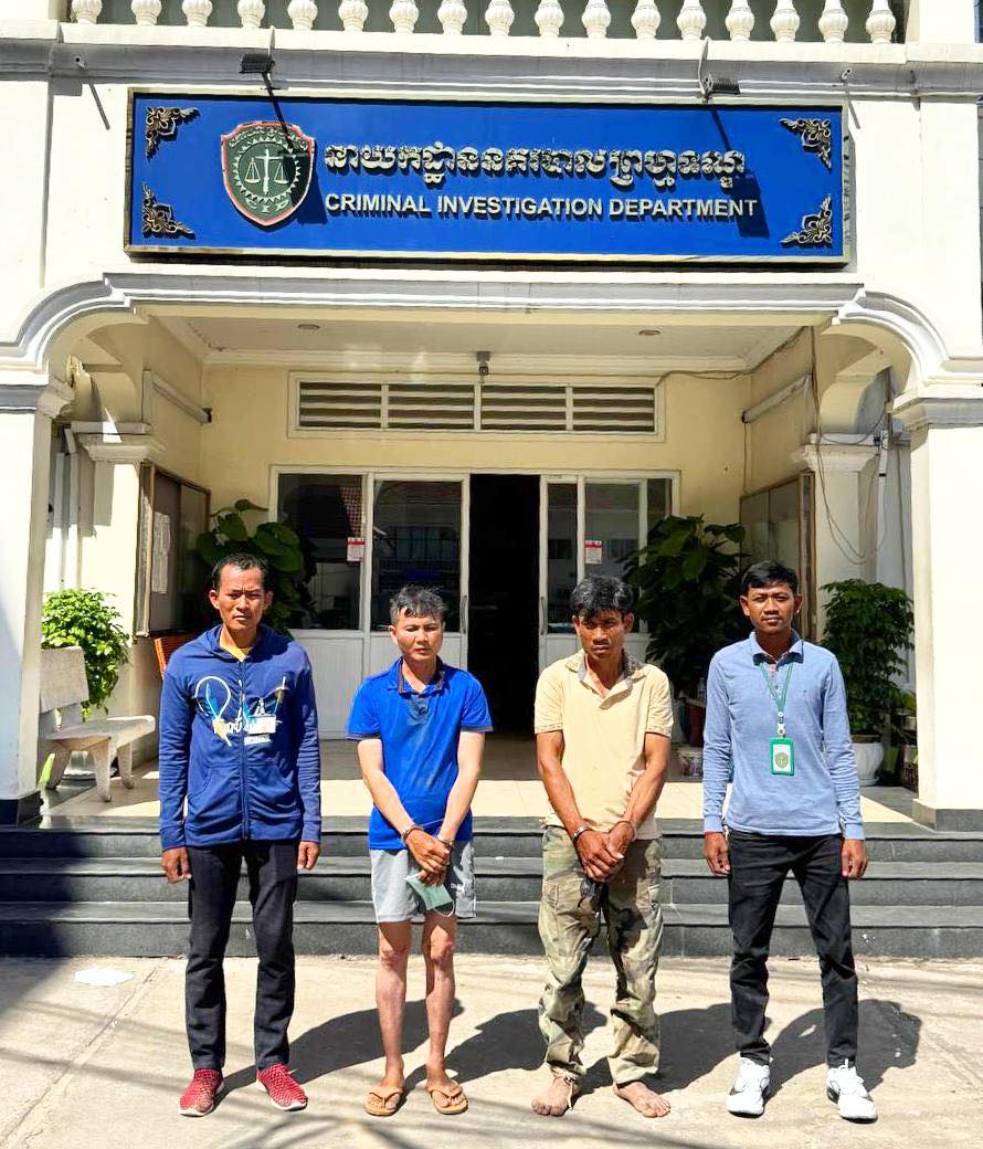 ជនសង្ស័យទាំង៤នាក់៖ ១-ឈ្មោះ ហ៊ុន សុវ៉ានដារ៉ា ភេទប្រុស អាយុ៣៥ឆ្នាំ ជនជាតិខ្មែរ ឃាត់ខ្លួនត្រង់ចំណុចភូមិចោមចៅ២ សង្កាត់ចោមចៅ២ ខណ្ឌពោធិ៍សែនជ័យ រាជធានីភ្នំពេញ ។២-ឈ្មោះ សាំង រក្សា ភេទប្រុស អាយុ៣៨ឆ្នាំ ជនជាតិខ្មែរ ឃាត់ខ្លួនត្រង់ចំណុច ភូមិត្របែក ឃុំស្រង់ ស្រុកគងពិសី ខេត្តកំពង់ស្ពឺ ។៣-ឈ្មោះ ម៉ាន់ វុទ្ធី ភេទប្រុស អាយុ៥៧ឆ្នាំ ជនជាតិខ្មែរ (ទទួលផលចោរកម្ម) ឃាត់ខ្លួនត្រង់ចំណុច ភូមិសាមគ្គី ឃុំអង្គ ស្រុកអង្គរបុរី ខេត្តតាកែវ ។ ៤-ឈ្មោះ នៅ គួក ភេទប្រុស អាយុ៣៥ឆ្នាំ ជនជាតិខ្មែរ (ទទួលផលចោរកម្ម) ឃាត់ខ្លួនត្រង់ចំណុច ភូមិតាមូង ឃុំព្រៃផ្គាំ ស្រុកអង្គរបុរី ខេត្តតាកែវ ។
