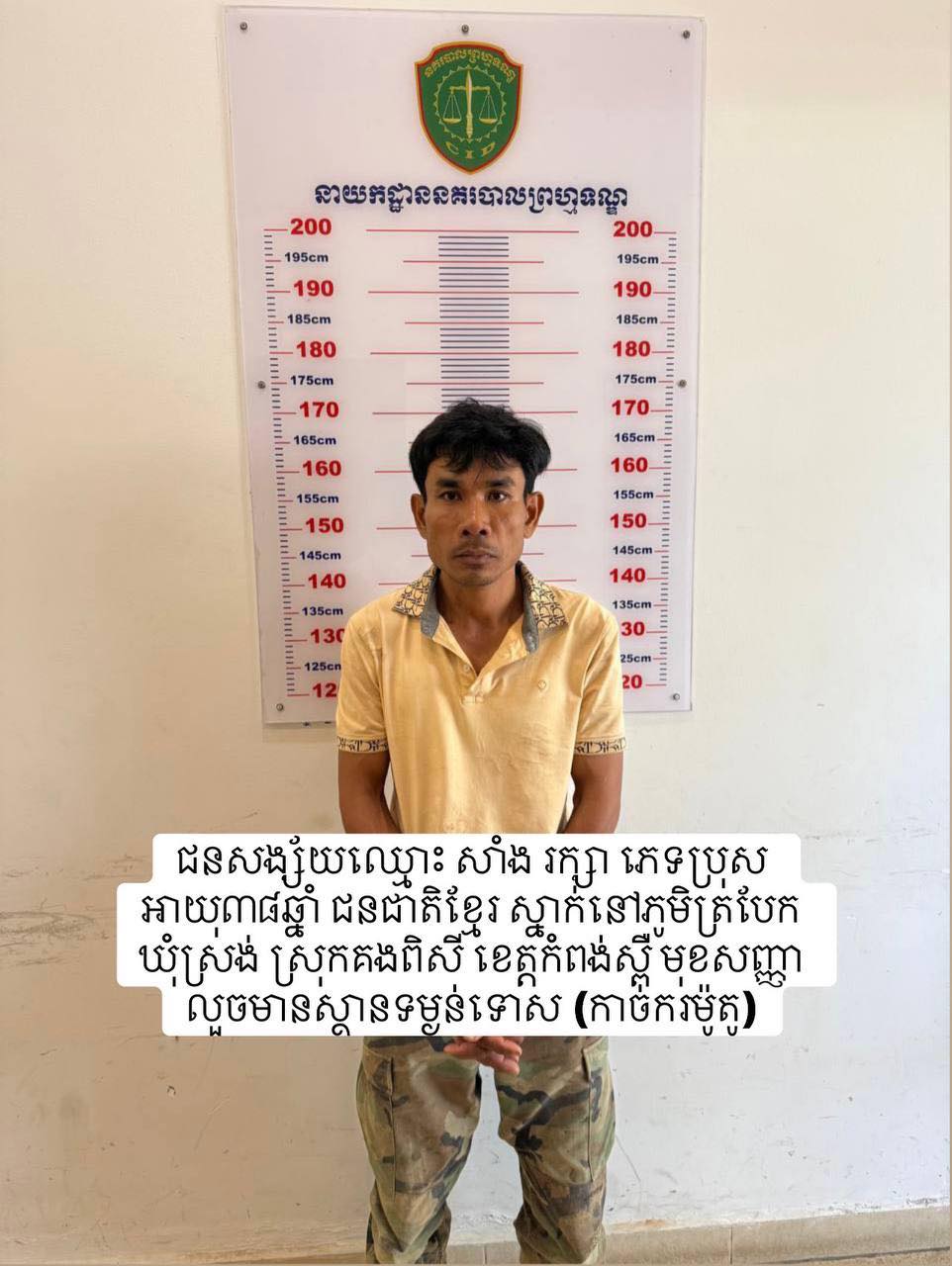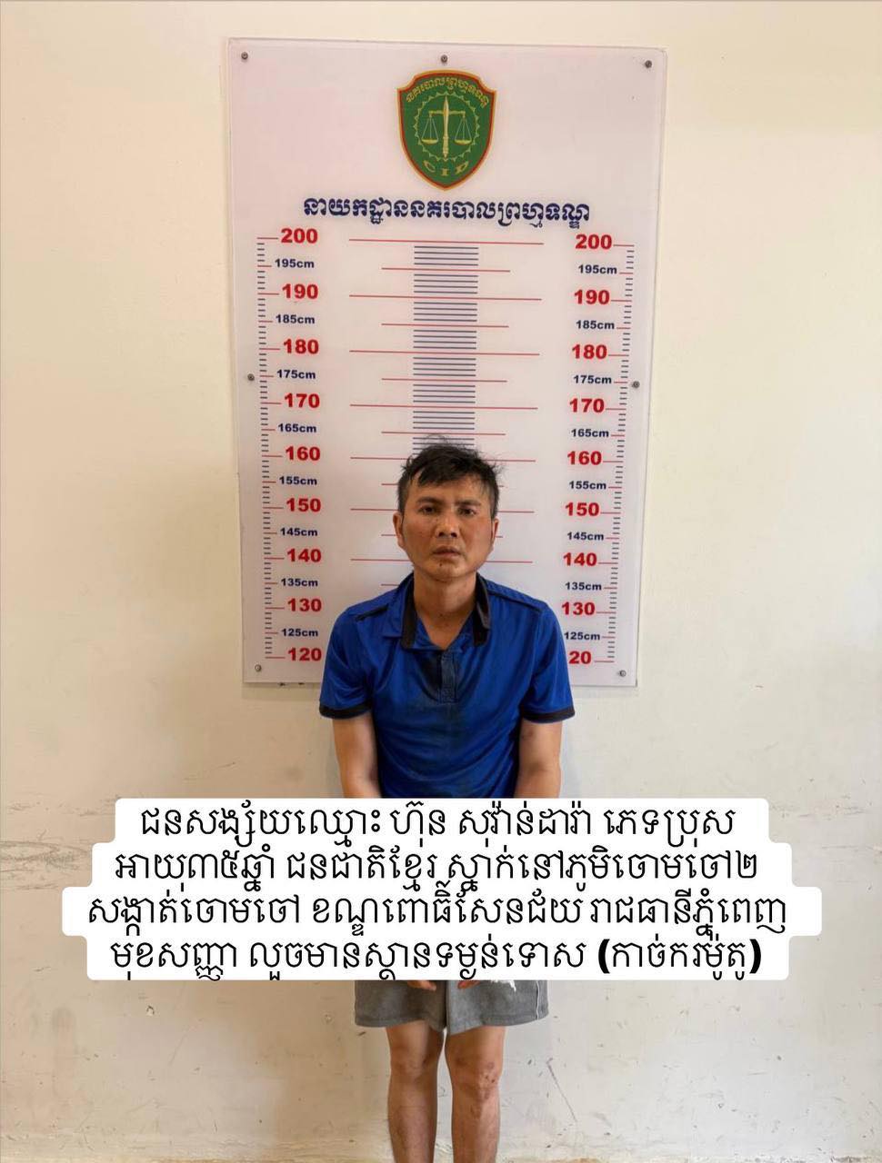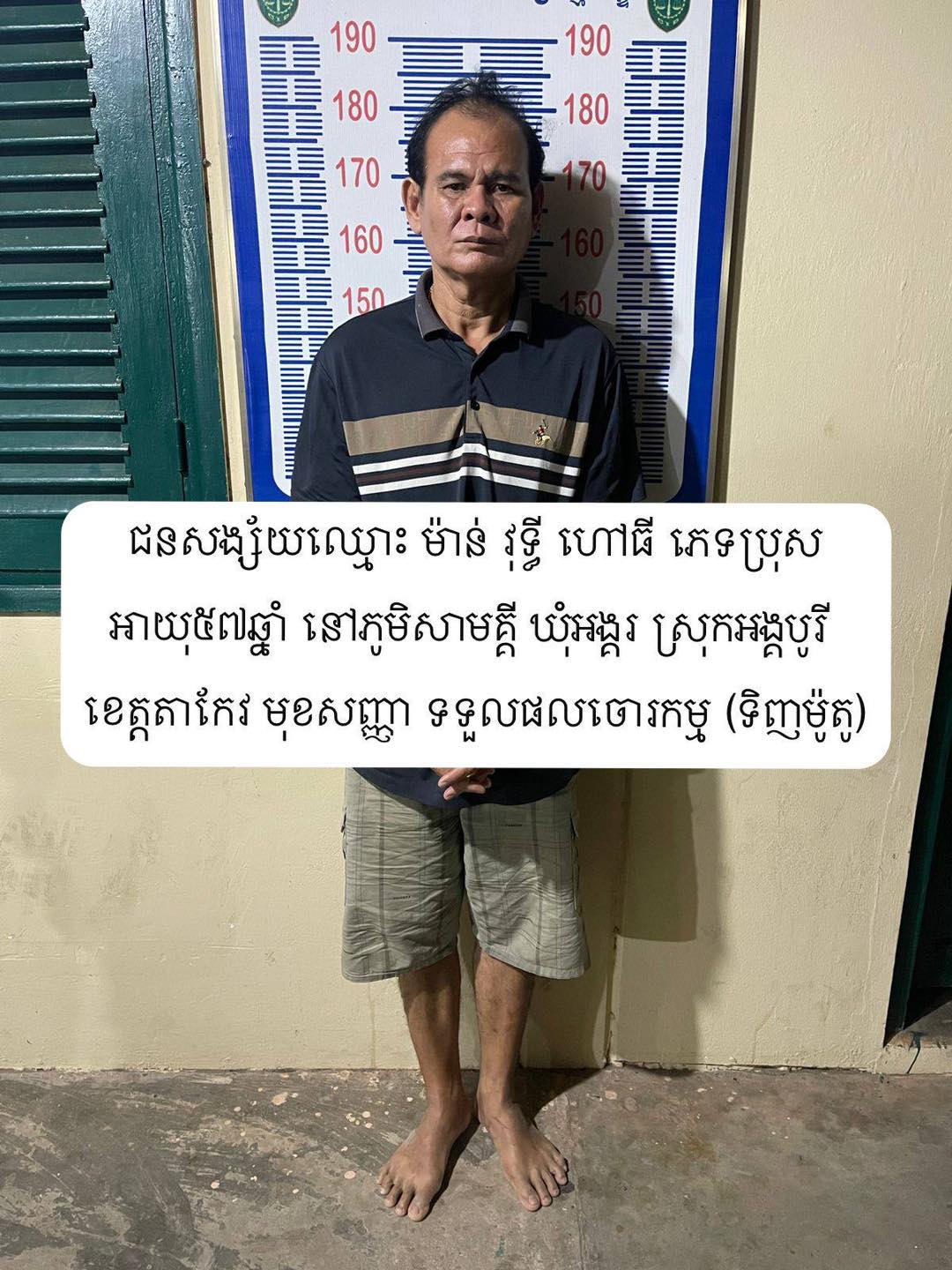 ជនសង្ស័យទាំង៤នាក់៖ ១-ឈ្មោះ ហ៊ុន សុវ៉ានដារ៉ា ភេទប្រុស អាយុ៣៥ឆ្នាំ ជនជាតិខ្មែរ ឃាត់ខ្លួនត្រង់ចំណុចភូមិចោមចៅ២ សង្កាត់ចោមចៅ២ ខណ្ឌពោធិ៍សែនជ័យ រាជធានីភ្នំពេញ ។២-ឈ្មោះ សាំង រក្សា ភេទប្រុស អាយុ៣៨ឆ្នាំ ជនជាតិខ្មែរ ឃាត់ខ្លួនត្រង់ចំណុច ភូមិត្របែក ឃុំស្រង់ ស្រុកគងពិសី ខេត្តកំពង់ស្ពឺ ។៣-ឈ្មោះ ម៉ាន់ វុទ្ធី ភេទប្រុស អាយុ៥៧ឆ្នាំ ជនជាតិខ្មែរ (ទទួលផលចោរកម្ម) ឃាត់ខ្លួនត្រង់ចំណុច ភូមិសាមគ្គី ឃុំអង្គ ស្រុកអង្គរបុរី ខេត្តតាកែវ ។ ៤-ឈ្មោះ នៅ គួក ភេទប្រុស អាយុ៣៥ឆ្នាំ ជនជាតិខ្មែរ (ទទួលផលចោរកម្ម) ឃាត់ខ្លួនត្រង់ចំណុច ភូមិតាមូង ឃុំព្រៃផ្គាំ ស្រុកអង្គរបុរី ខេត្តតាកែវ ។