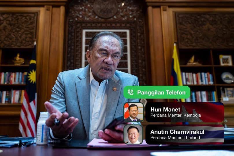 (គូឡាឡាំពួ)៖ នៅលើទំព័រ Facebook នៅថ្ងៃអាទិត្យ ទី២១ ខែធ្នូ របស់នាយករដ្ឋមន្ត្រីម៉ាឡេស៊ី លោក អាន់វ៉ា អ៉ីប្រាហ៊ីម បាននិយាយថា រូបលោកមានឱកាសភ្ជាប់ទំនាក់ទំនងជាមួយ នាយករដ្ឋមន្ត្រីកម្ពុជាសម្ដេចធិបតី ហ៊ុន ម៉ាណែត និងនាយករដ្ឋមន្ត្រីថៃ​ លោក អានុទីន ដើម្បីផ្លាស់ប្ដូរយោបល់ និងពិភាក្សាអំពីមធ្យោបាយល្អនានាសំដៅឆ្ពោះទៅរកការបន្ធូរបន្ថយភាពតានតឹងដែលកំពុងកើនឡើង រវាងប្រទេសទាំង២។
