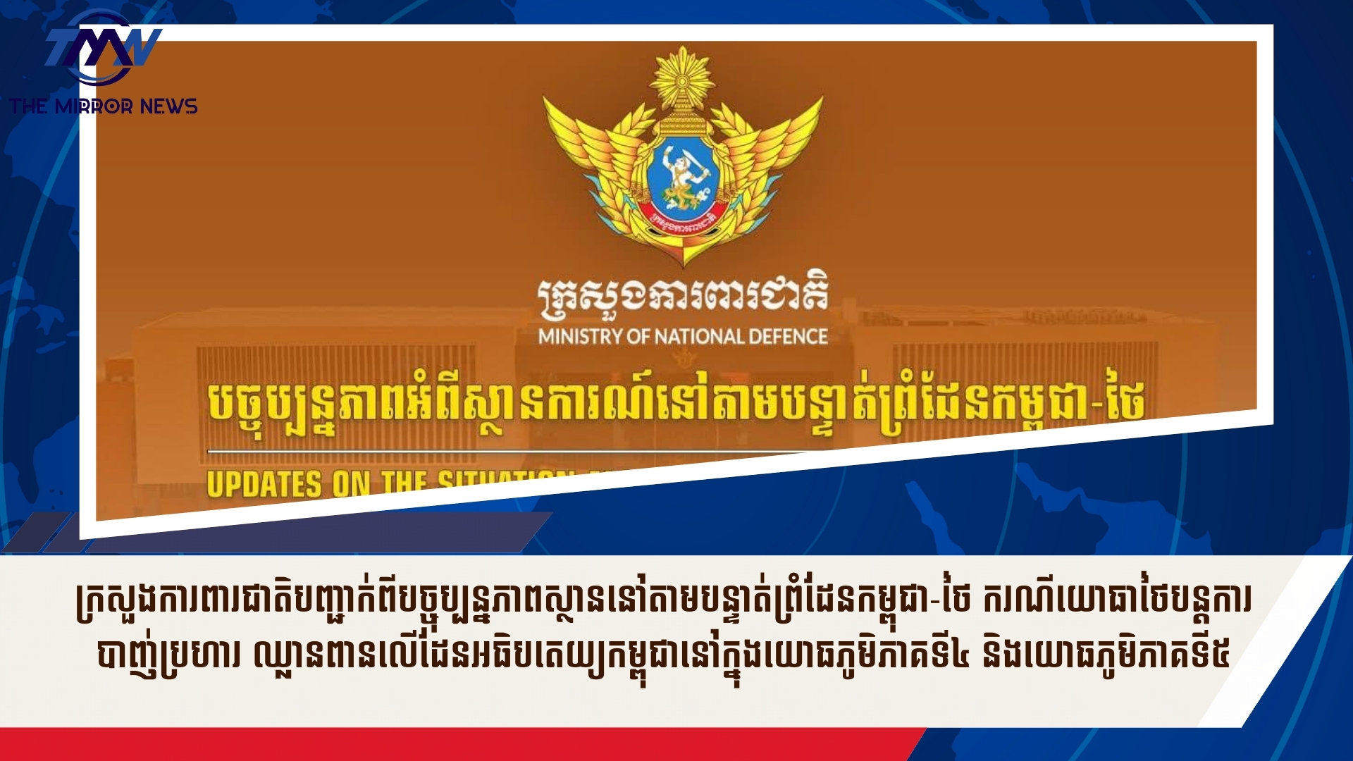 ក្រសួងការពារជាតិបញ្ជាក់ពីបច្ចុប្បន្នភាពស្ថាននៅតាមបន្ទាត់ព្រំដែនកម្ពុជា-ថៃ ករណីយោធាថៃបន្តការបាញ់ប្រហារ ឈ្លានពានលើដែនអធិបតេយ្យកម្ពុជានៅក្នុងយោធភូមិភាគទី៤ និងយោធភូមិភាគទី៥