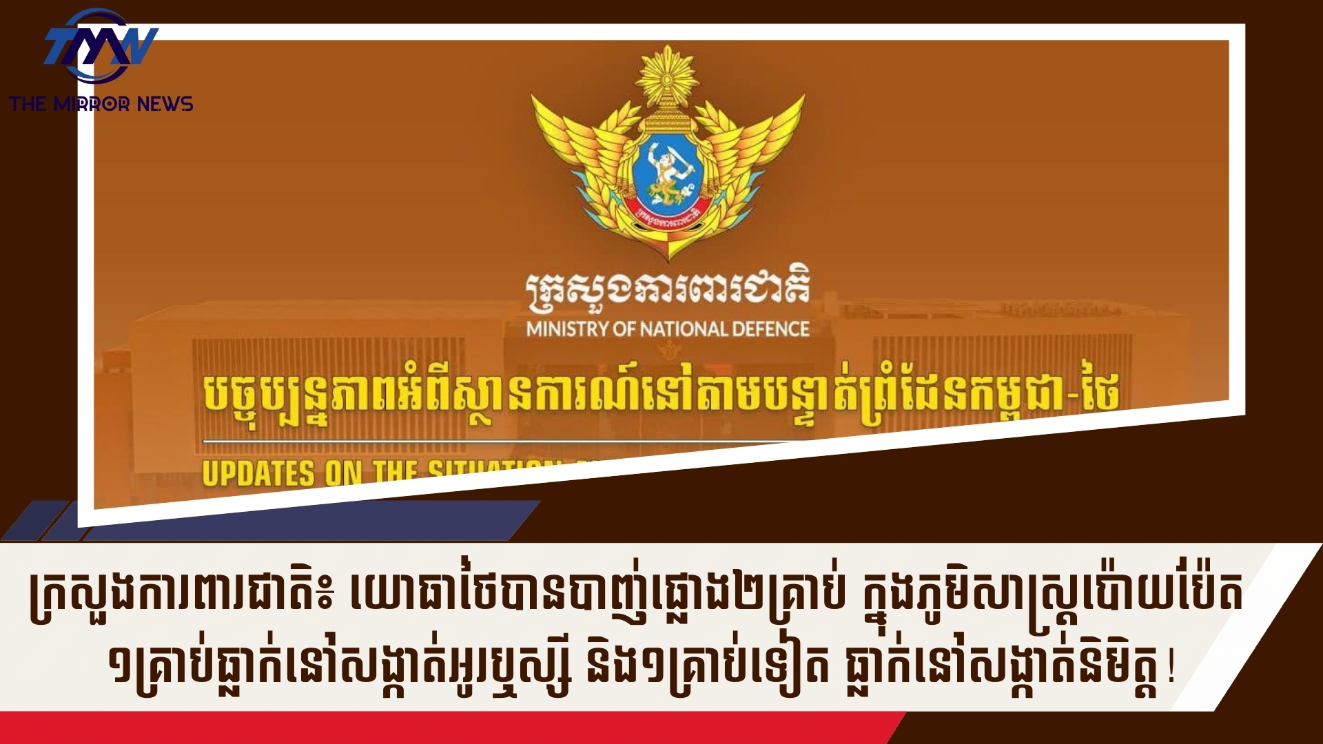 នេះបើតាមសេចក្ដីជូនដំណឹងរបស់ក្រសួងការពារជាតិបានធ្វើការជម្រាបជូនពីស្ថានការណ៍នៅតាមបន្ទាត់ព្រំដែនកម្ពុជា-ថៃ អំពីករណីយោធាថៃនៅតែបន្តធ្វើសកម្មភាពបាញ់ប្រហារចូលទីតាំងប្រជាជនស៊ីវិលកម្ពុជានៅយោធភូមិភាគទី៥ ក្នុងភូមិសាស្ត្រក្រុងប៉ោយប៉ែត ខេត្តបន្ទាយមានជ័យ នាថ្ងៃទី២៣ ខែធ្នូ ឆ្នាំ២០២៥នេះ។