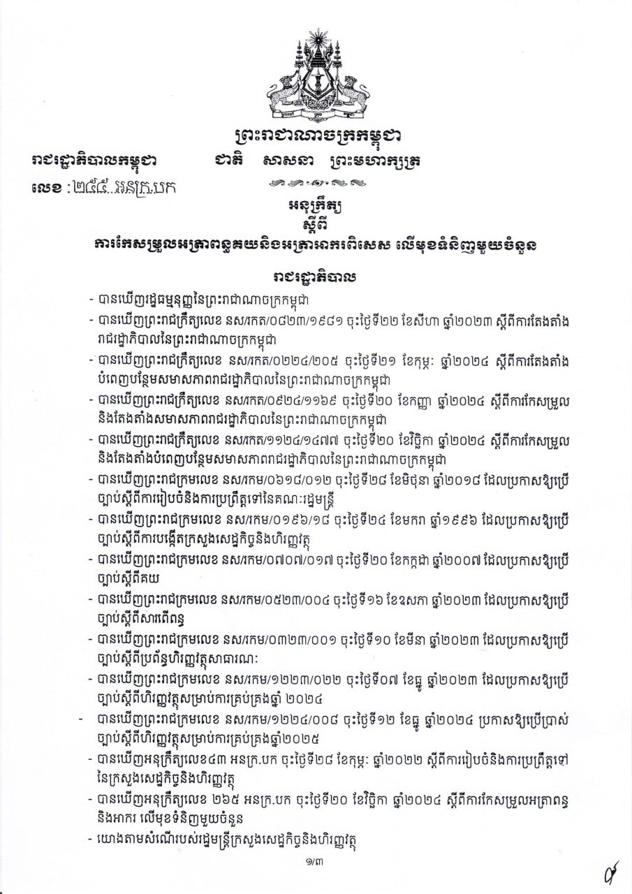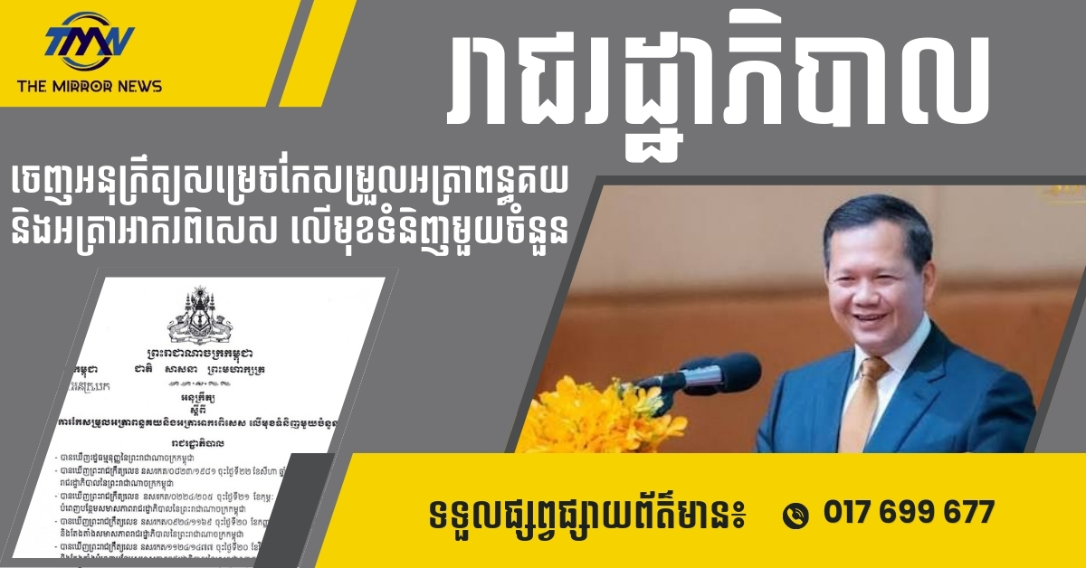 (ភ្នំពេញ)៖ រាជរដ្ឋាភិបាលកម្ពុជាបានចេញអនុក្រឹត្យថ្មីមួយ ដោយសម្រេចកែសម្រួលអត្រាពន្ធគយ និងអត្រាអាករពិសេស លើមុខទំនិញមួយចំនួន។ នេះបើតាមអនុក្រឹត្យដែលបណ្តាញសារព័ត៌មាន The Mirror News ទទួលបាននៅថ្ងៃនេះ។