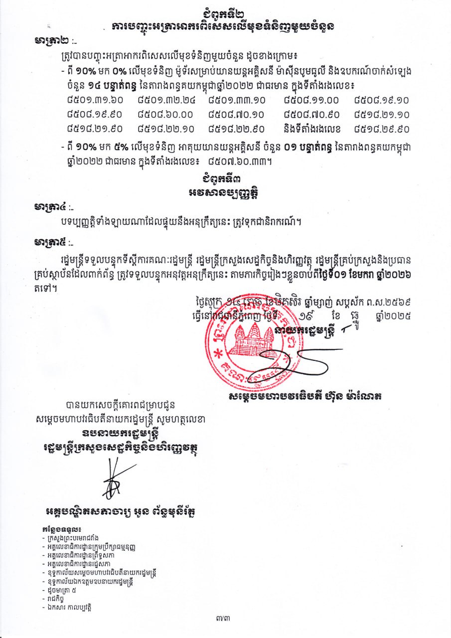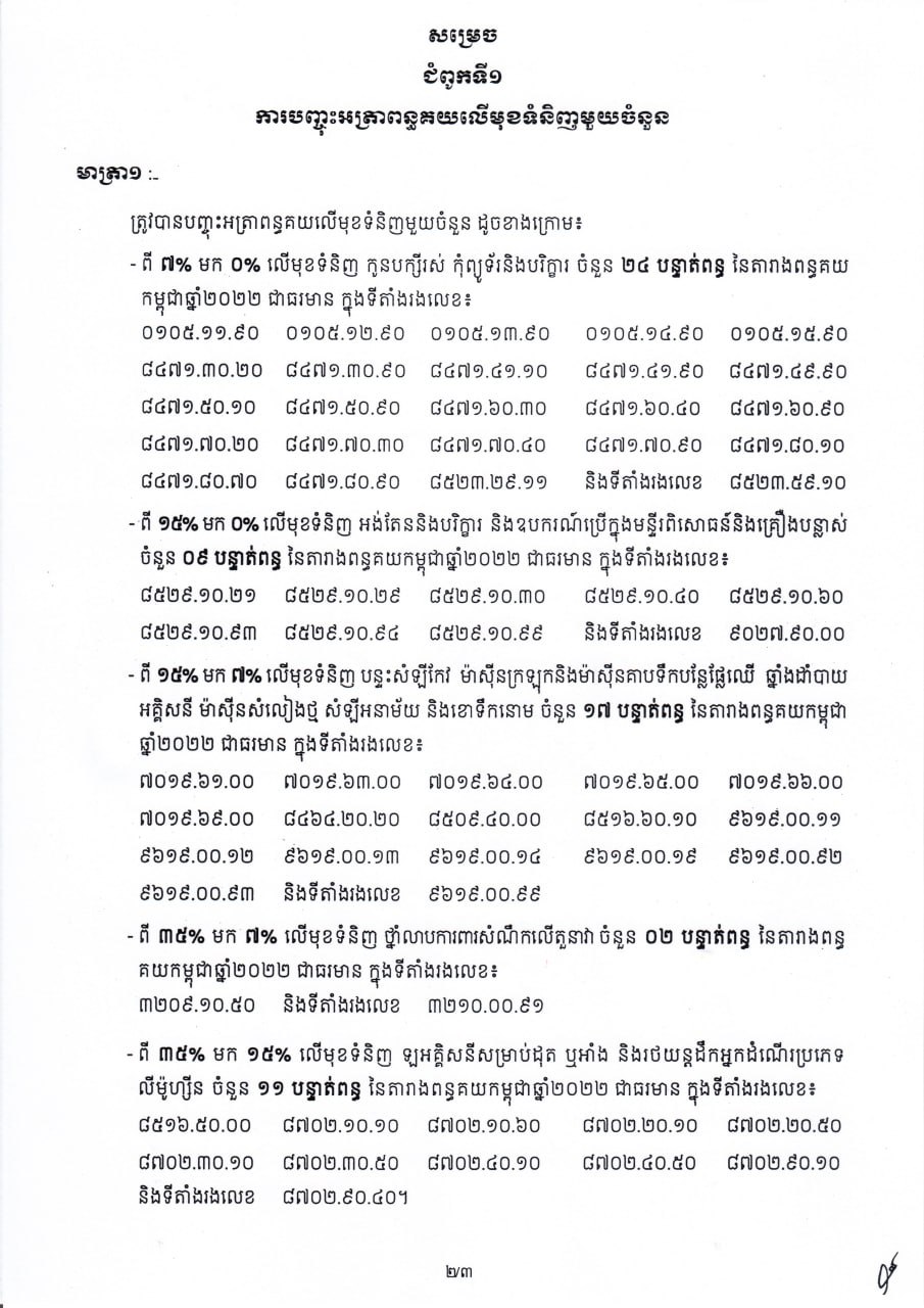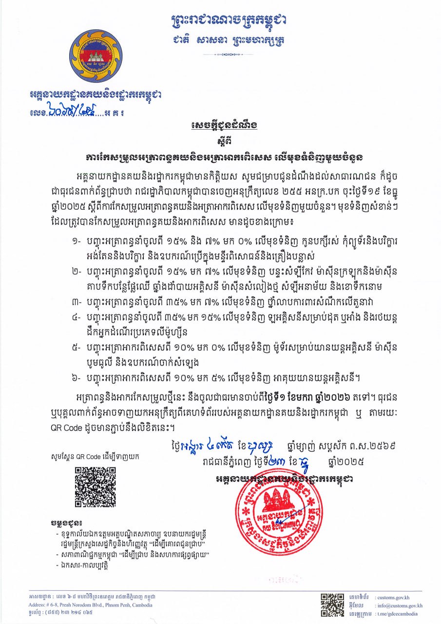 អត្រាពន្ធនិងអាករកែសម្រួលថ្មីនេះ នឹងចូលជាធរមានចាប់ពីថ្ងៃទី១ ខែមករា ឆ្នាំ២០២៦ តទៅ៕