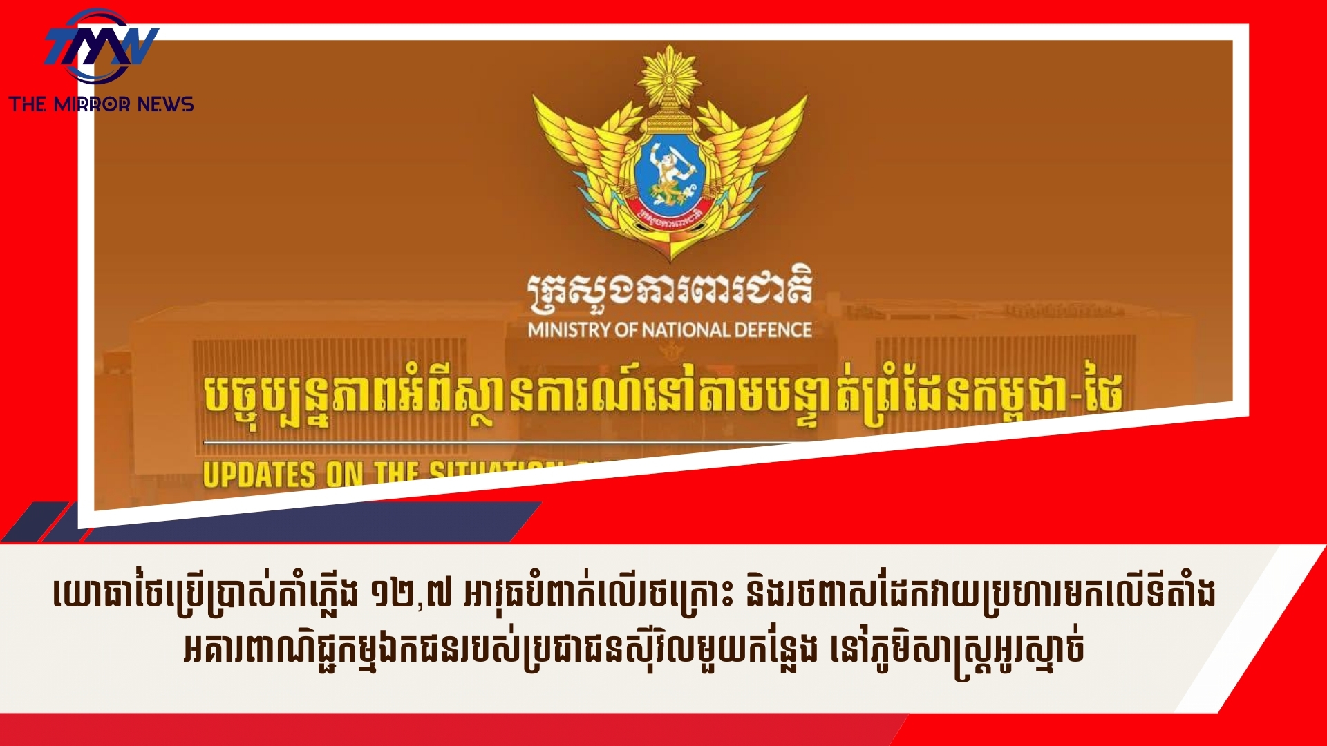 (ឧត្តរមានជ័យ)៖ ក្រសួងការពារជាតិ សូមជម្រាបជូននូវស្ថានការណ៍នៅតាមបន្ទាត់ព្រំដែនកម្ពុជា-ថៃ អំពី ករណីយោធាថៃនៅតែបន្តធ្វើសកម្មភាពបាញ់ប្រហារចូលទីតាំងប្រជាជនស៊ីវិលកម្ពុជា និងហេដ្ឋារចនាសម្ព័ន្ធស៊ីវិល នៅយោធភូមិភាគទី៤ ក្នុងភូមិសាស្រ្តអូរស្មាច់ ក្រុងសំរោង ខេត្តឧត្តរមានជ័យ នាថ្ងៃទី២៤ ខែធ្នូ ឆ្នាំ២០២៥៖