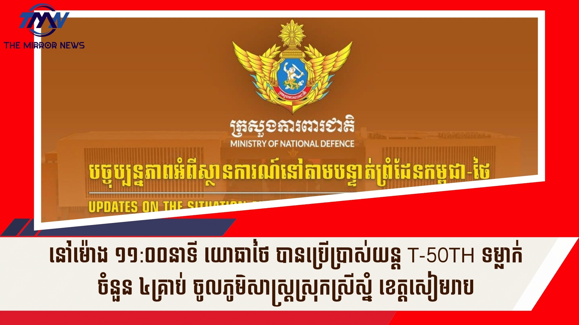 នៅម៉ោង ១១:០០នាទី យោធាថៃ បានប្រើប្រាស់យន្ត T-50TH ទម្លាក់ចំនួន ៤គ្រាប់ ចូលភូមិសាស្ត្រស្រុកស្រីស្នំ ខេត្តសៀមរាប