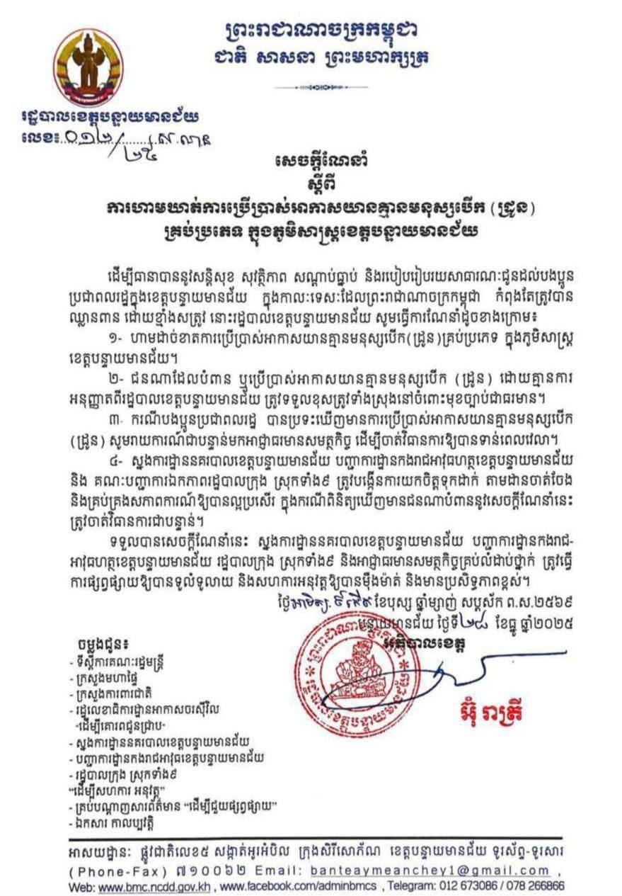 រដ្ឋបាលខេត្តបន្ទាយមានជ័យហាមដាច់ខាតការប្រើប្រាស់អាកាសយានគ្មានមនុស្សបើក (ជ្រួន) គ្រប់ប្រភេទ ក្នុងភូមិសាស្ត្រ