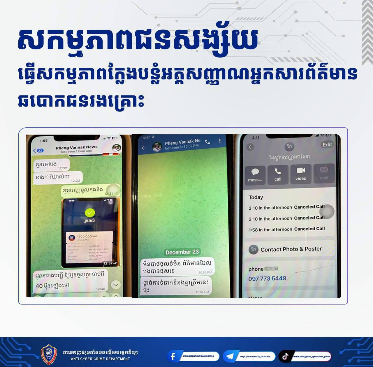 (ភ្នំពេញ)៖ យោងតាមបទបញ្ជារបស់នាយឧត្ដមសេនីយ៍ ស ថេត អគ្គស្នងការនគរបាលជាតិ និងតាមការចង្អុលណែនាំពីឧត្ដមសេនីយ៍ឯក អគ្គស្នងការរងនគរបាលជាតិ និងដោយមានការសម្របសម្រួលពីព្រះរាជអាជ្ញាអមសាលាដំបូងរាជធានីភ្នំពេញ នៅថ្ងៃទី២៩ ខែធ្នូ ឆ្នាំ២០២៥ នាយកដ្ឋានប្រឆាំងបទល្មើសបច្ចេកវិទ្យា បានធ្វើការស្រាវជ្រាវ និងឃាត់ខ្លួនជនសង្ស័យ០១រូប ឈ្មោះ គ.ណ.រ ភេទប្រុស អាយុ២៤ឆ្នាំ ជនជាតិខ្មែរ ដោយជនសង្ស័យបានប្រើប្រាស់គណនីតេឡេក្រាមឈ្មោះ PHENG NAKNAK, Pheng Vannak News និងលេខទូរស័ព្ទជាច្រើនខ្សែ យកទៅគំរាមទារប្រាក់ពីជនរងគ្រោះ និងឱ្យផ្ទេរប្រាក់ទៅគណនីធនាគារជាច្រើន ដើម្បីទទួលផលប្រយោជន៍ពីអំពើទុច្ចរិតនេះ។