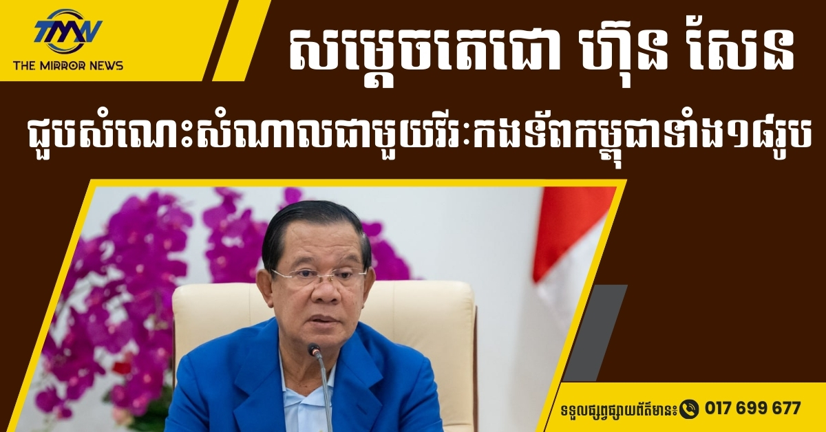 នៅព្រឹកនេះ សម្តេចតេជោជួបសំណេះសំណាលជាមួយវីរៈកងទ័ពកម្ពុជាទាំង១៨រូប ដែលបានធ្វើមាតុភូមិនិវត្តន៍មកកម្ពុជាវិញ ដោយសុខសុវត្ថិភាព នៅវិមាន៧មករា រាជធានីភ្នំពេញ