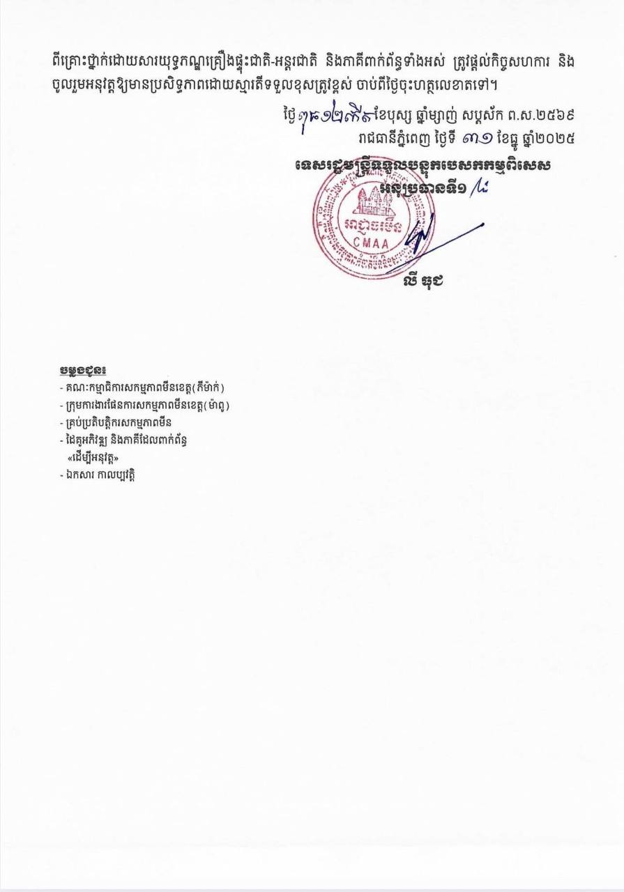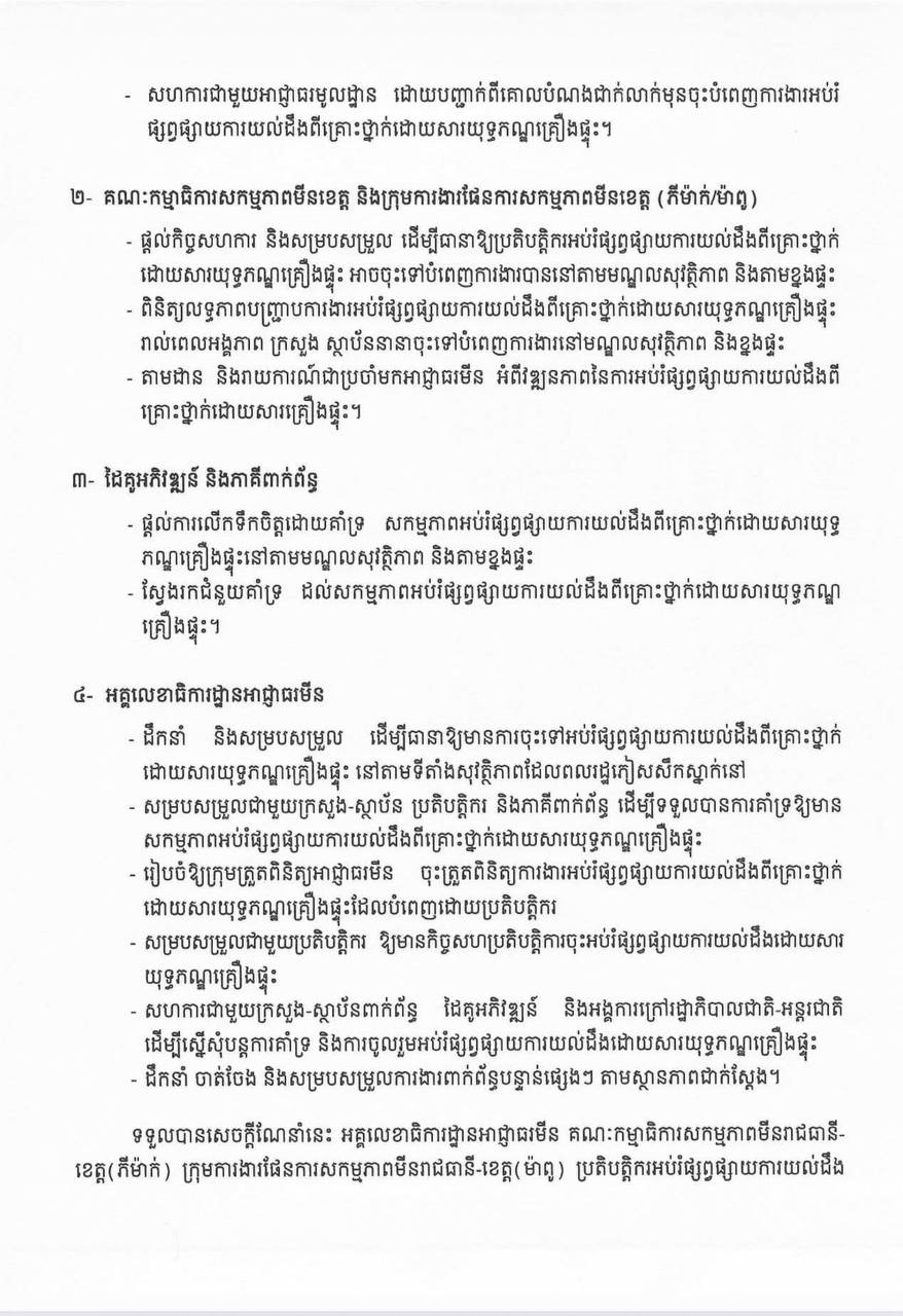 *២- គណៈកម្មាធិការសកម្មភាពមីនខេត្ត និងក្រុមការងារផែនការសកម្មភាពមីនខេត្ត (ភីម៉ាក់/ម៉ាពូ) *ផ្តល់កិច្ចសហការ និងសម្របសម្រួល ដើម្បីធានាឱ្យប្រតិបត្តិករអប់រំផ្សព្វផ្សាយការយល់ដឹងពីគ្រោះថ្នាក់ ដោយសារយុទ្ធភណ្ឌគ្រឿងផ្ទុះ អាចចុះទៅបំពេញការងារបាននៅតាមមណ្ឌលសុវត្ថិភាព និងតាមខ្នងផ្ទះ *ពិនិត្យលទ្ធភាពបញ្ញាបការងារអប់រំផ្សព្វផ្សាយការយល់ដឹងពីគ្រោះថ្នាក់ដោយសារយុទ្ធភណ្ឌគ្រឿងផ្ទុះ រាល់ពេលអង្គភាព ក្រសួង ស្ថាប័ននានាចុះទៅបំពេញការងារនៅមណ្ឌលសុវត្ថិភាព និងខ្នងផ្ទះគ្រោះថ្នាក់ដោយសារយុទ្ធភណ្ឌគ្រឿងផ្ទុះជាតិ-អន្តរជាតិ និងភាគីពាក់ព័ន្ធទាំងអស់ ត្រូវផ្តល់កិច្ចសហការ និង ចូលរួមអនុវត្តឱ្យមានប្រសិទ្ធភាពដោយស្មារតីទទួលខុសត្រូវខ្ពស់ ចាប់ពីថ្ងៃចុះហត្ថលេខាតទៅ។ *តាមដាន និងរាយការណ៍ជាប្រចាំមកអាជ្ញាធរមីន អំពីវឌ្ឍនភាពនៃការអប់រំផ្សព្វផ្សាយការយល់ដឹងពី គ្រោះថ្នាក់ដោយសារគ្រឿងផ្ទុះ។