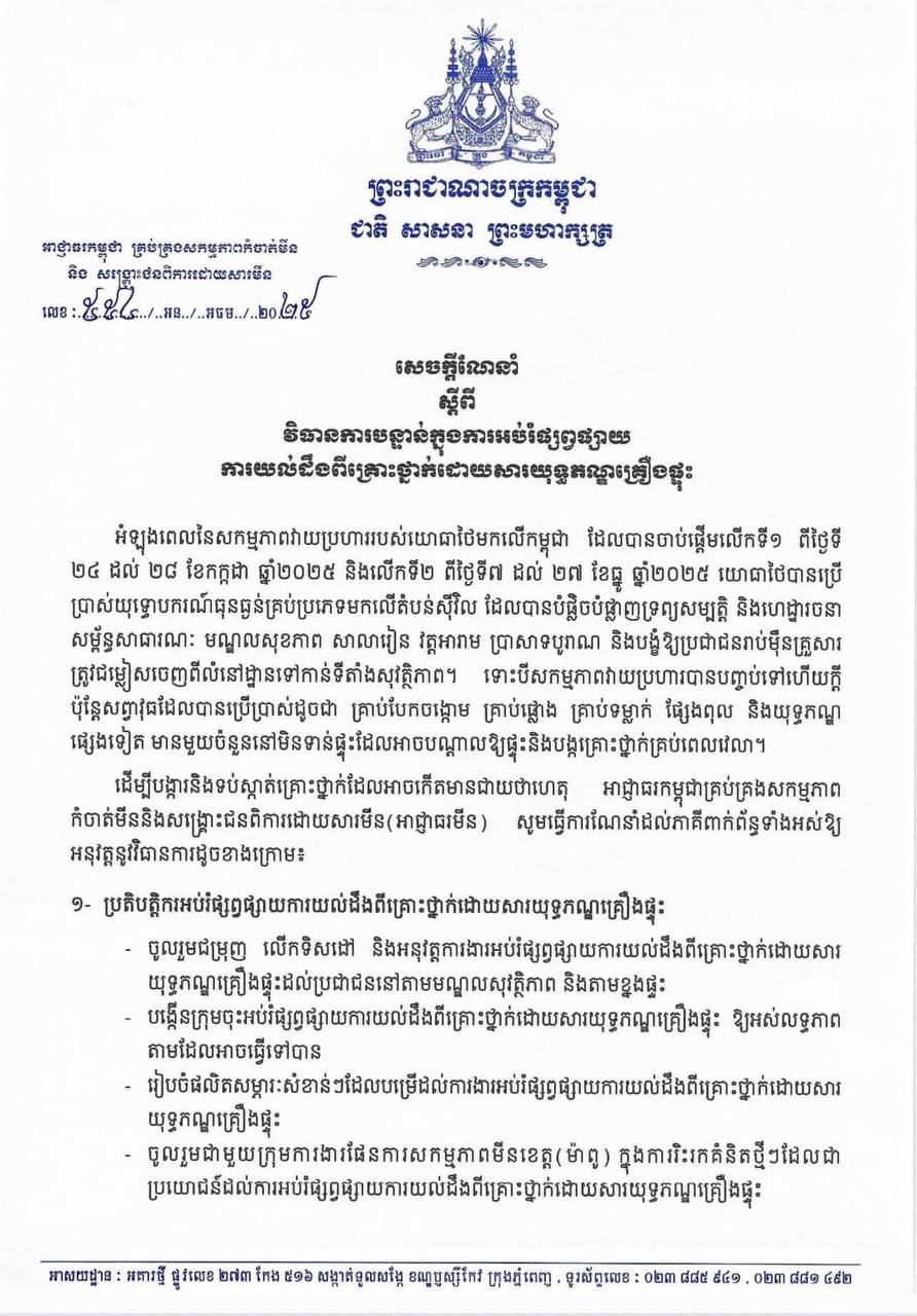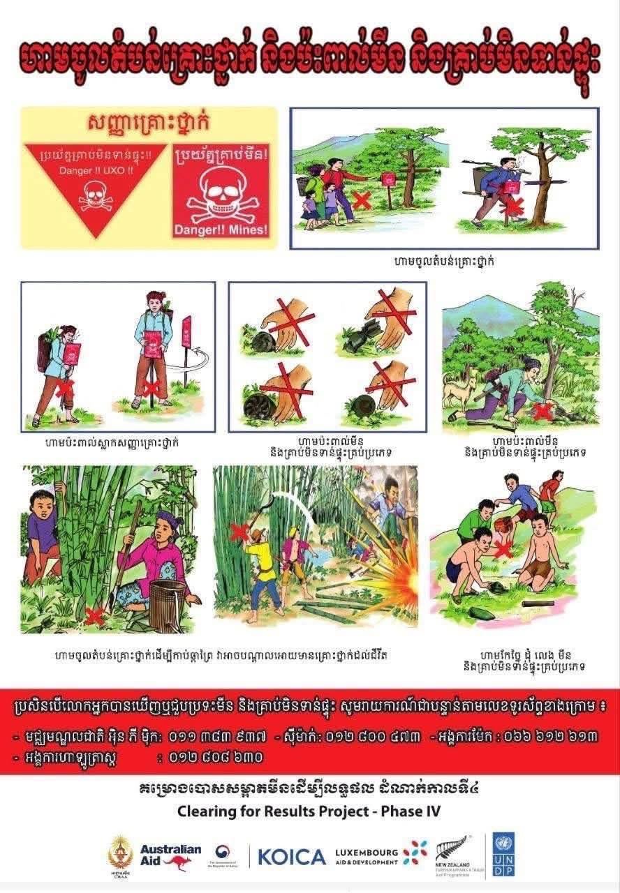 ដើម្បីបង្ការនិងទប់ស្កាត់គ្រោះថ្នាក់ដែលអាចកើតមានជាយថាហេតុ អាជ្ញាធរកម្ពុជាគ្រប់គ្រងសកម្មភាព កំចាត់មីននិងសង្គ្រោះជនពិការដោយសារមីន(អាជ្ញាធរមីន) សូមធ្វើការណែនាំដល់ភាគីពាក់ព័ន្ធទាំងអស់ឱ្យ អនុវត្តនូវវិធានការដូចខាងក្រោម៖