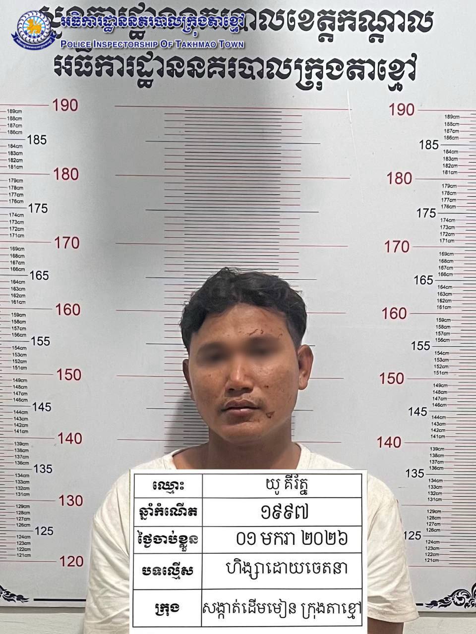 ប្រភពបានបញ្ជាក់ថា ដោយអនុវត្តតាមការបញ្ជាដឹកនាំដោយផ្ទាល់ពីលោកឧត្តមសេនីយ៍ទោ ឈឿន សុចិត្ត ស្នងការនៃស្នងការដ្ឋាននគរបាលខេត្តកណ្តាល នាយប់ថ្ងៃទី០១ ខែមករា ឆ្នាំ២០២៦ ផ្នែកនគរបាលព្រហ្មទណ្ឌ ក្រុមអន្តរាគន៍ល្បាត និង ប៉ុស្តិ៍នគរបាលរដ្ឋបាលដើមមៀន ដឹកនាំដោយ លោកវរសេនីយ៍ឯក យី វណ្ណដា អធិការនៃអធិការដ្ឋាននគរបាលក្រុងតាខ្មៅ បង្ក្រាបជាក់ស្តែង ឃាត់បានជនសង្ស័យ១នាក់ឈ្មោះ ឈ្មោះ យូ គីរ័ត្ន ភេទប្រុស អាយុ២៨ឆ្នាំ មុខរបរសន្តិសុខអគ្គិសនី រស់នៅភូមិព្រែកតាឡុង៣ សង្កាត់ចាក់អង្រែក្រោម ខណ្ឌមានជ័យ រាជធានីភ្នំពេញ ចំណែកបក្សពួក៦នាក់រត់គេចខ្លួនរួមមាន៖ ១-ឈ្មោះ រក្សា ភេទប្រុស អាយុ២៣ឆ្នាំ មុខរបរមិនពិតប្រាកដ ២-ឈ្មោះ ឡុង ភេទប្រុស អាយុ២៥ឆ្នាំ មុខរបររត់ផាស់អាប់ ៣-ឈ្មោះ ឡា ភេទប្រុស អាយុ៣៦ឆ្នាំ មុខរបរមិនពិតប្រាកដ ៤-ឈ្មោះ អាបុី ភេទប្រុស អាយុ៤០ឆ្នាំ មុខរបរមិនពិតប្រាកដ ទាំង៥នាក់រស់នៅ សង្កាត់ចាក់អង្រែលើនិងសង្កាត់ចាក់អង្រែក្រោម ខណ្ឌមានជ័យ រាជធានីភ្នំពេញ និង ៥-ឈ្មោះ ណេត ភេទប្រុស អាយុ២១ឆ្នាំ មុខរបរអ្នកដឹកជញ្ចូន រស់នៅភូមិដើមមៀន សង្កាត់ដើមមៀន ក្រុងតាខ្មៅ ខេត្តកណ្តាល ។ រួមជាមួយវត្ថុតាងចាប់យកបានមានមួកការពារសុវត្ថិភាពចំនួន១ ។