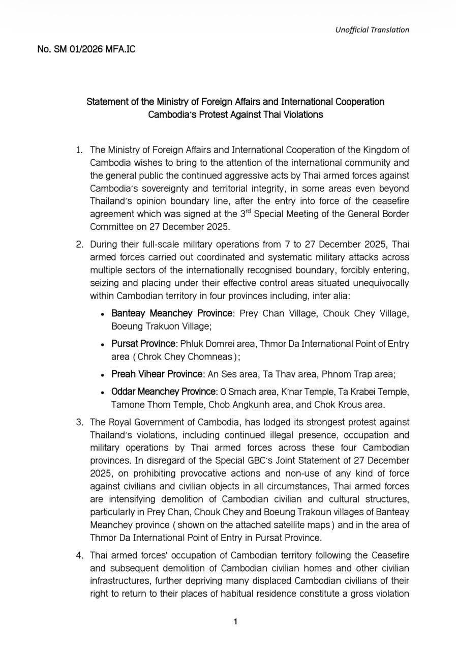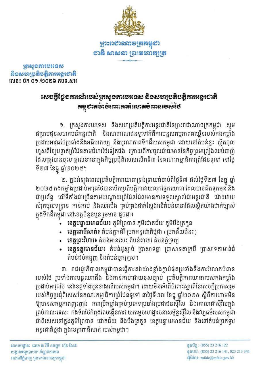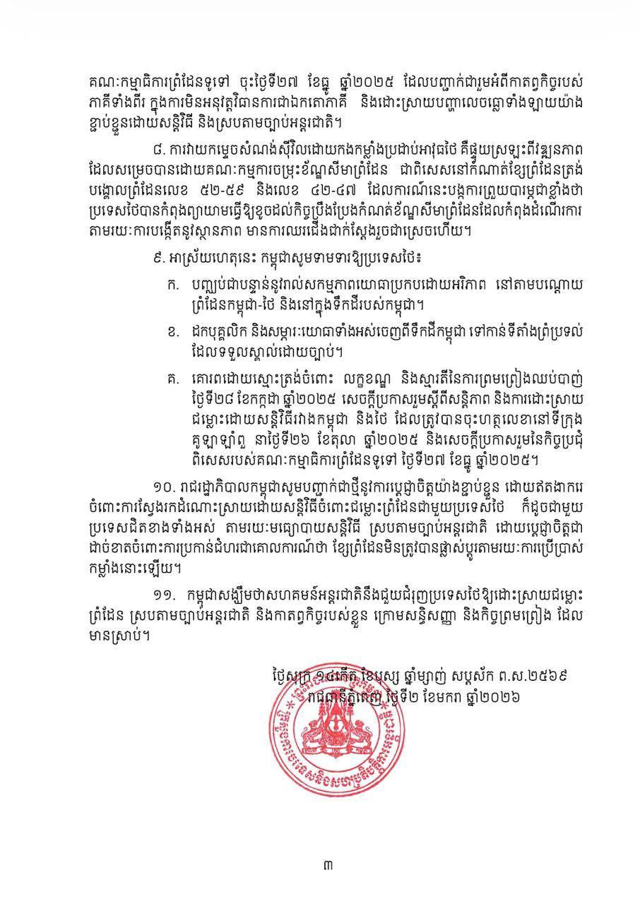 ៣. រាជរដ្ឋាភិបាលកម្ពុជាបានធ្វើការតវ៉ាយ៉ាងខ្លាំងក្លាបំផុតប្រឆាំងនឹងការរំលោភបំពាន របស់ថៃ រួមទាំងការបន្តឈរជើង និងកាន់កាប់ដោយខុសច្បាប់ ប្រតិបត្តិការយោធារបស់កងកម្លាំងប្រដាប់អាវុធថៃ នៅខេត្តទាំងបួនខាងលើរបស់កម្ពុជា។ ដោយមិនអើពើចំពោះស្មារតីនៃសេចក្តីប្រកាសរួមរបស់កិច្ចប្រជុំពិសេសនៃគណៈកម្មាធិការព្រំដែនទូទៅ នាថ្ងៃទី២៧ ខែធ្នូ ឆ្នាំ២០២៥ ស្តីពីការហាមមិនឱ្យមានសកម្មភាពញុះញង់ ការប្រើកម្លាំងគ្រប់ប្រភេទប្រឆាំងប្រជាជនស៊ីវិល និងគោលដៅស៊ីវិលក្នុងគ្រប់កាលៈទេសៈ កងទ័ពថៃកំពុងតែបង្កើនការវាយកម្ទេចហេដ្ឋារចនាសម្ព័ន្ធស៊ីវិល និងវប្បធម៌របស់កម្ពុជា ជាពិសេសនៅក្នុងភូមិព្រៃចាន់ ជោគជ័យ និងបឹងត្រកួន ខេត្តបន្ទាយមានជ័យ និងនៅតំបន់ច្រកទ្វារអន្តរជាតិថ្មដា ក្នុងខេត្តពោធិ៍សាត់ របស់កម្ពុជា។
