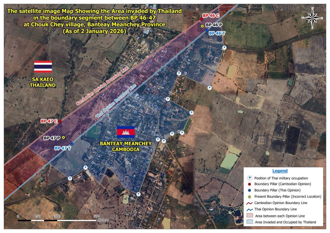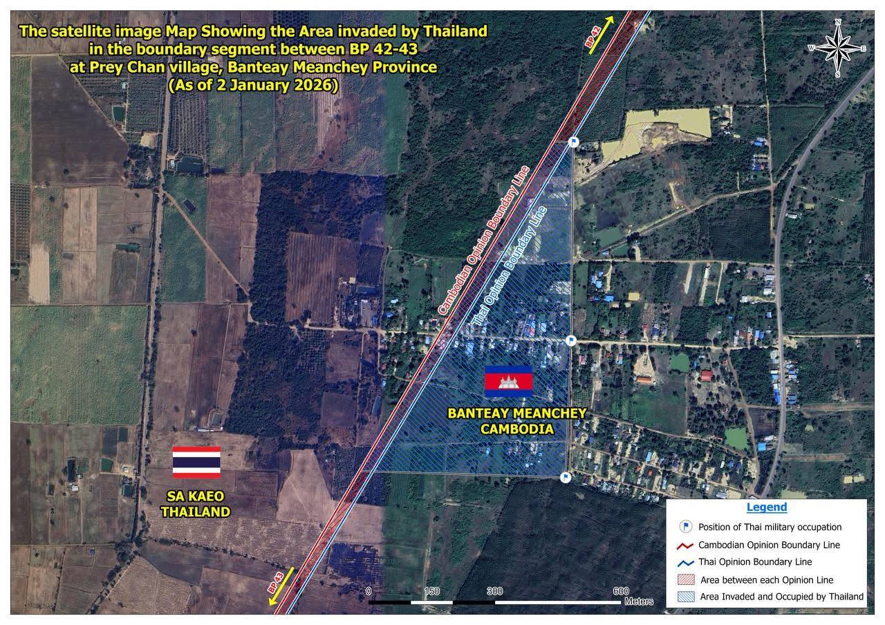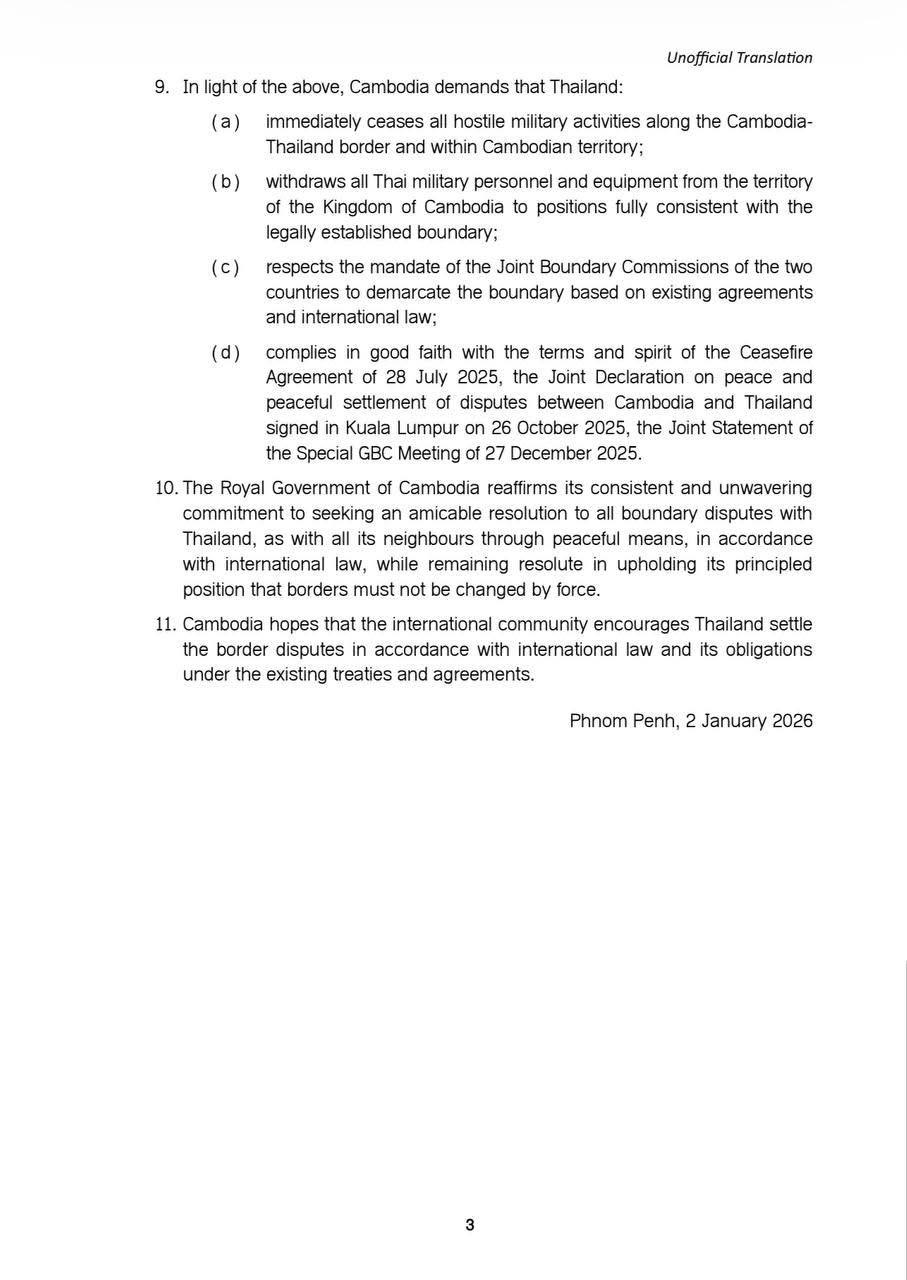 ៣. រាជរដ្ឋាភិបាលកម្ពុជាបានធ្វើការតវ៉ាយ៉ាងខ្លាំងក្លាបំផុតប្រឆាំងនឹងការរំលោភបំពាន របស់ថៃ រួមទាំងការបន្តឈរជើង និងកាន់កាប់ដោយខុសច្បាប់ ប្រតិបត្តិការយោធារបស់កងកម្លាំងប្រដាប់អាវុធថៃ នៅខេត្តទាំងបួនខាងលើរបស់កម្ពុជា។ ដោយមិនអើពើចំពោះស្មារតីនៃសេចក្តីប្រកាសរួមរបស់កិច្ចប្រជុំពិសេសនៃគណៈកម្មាធិការព្រំដែនទូទៅ នាថ្ងៃទី២៧ ខែធ្នូ ឆ្នាំ២០២៥ ស្តីពីការហាមមិនឱ្យមានសកម្មភាពញុះញង់ ការប្រើកម្លាំងគ្រប់ប្រភេទប្រឆាំងប្រជាជនស៊ីវិល និងគោលដៅស៊ីវិលក្នុងគ្រប់កាលៈទេសៈ កងទ័ពថៃកំពុងតែបង្កើនការវាយកម្ទេចហេដ្ឋារចនាសម្ព័ន្ធស៊ីវិល និងវប្បធម៌របស់កម្ពុជា ជាពិសេសនៅក្នុងភូមិព្រៃចាន់ ជោគជ័យ និងបឹងត្រកួន ខេត្តបន្ទាយមានជ័យ និងនៅតំបន់ច្រកទ្វារអន្តរជាតិថ្មដា ក្នុងខេត្តពោធិ៍សាត់ របស់កម្ពុជា។
