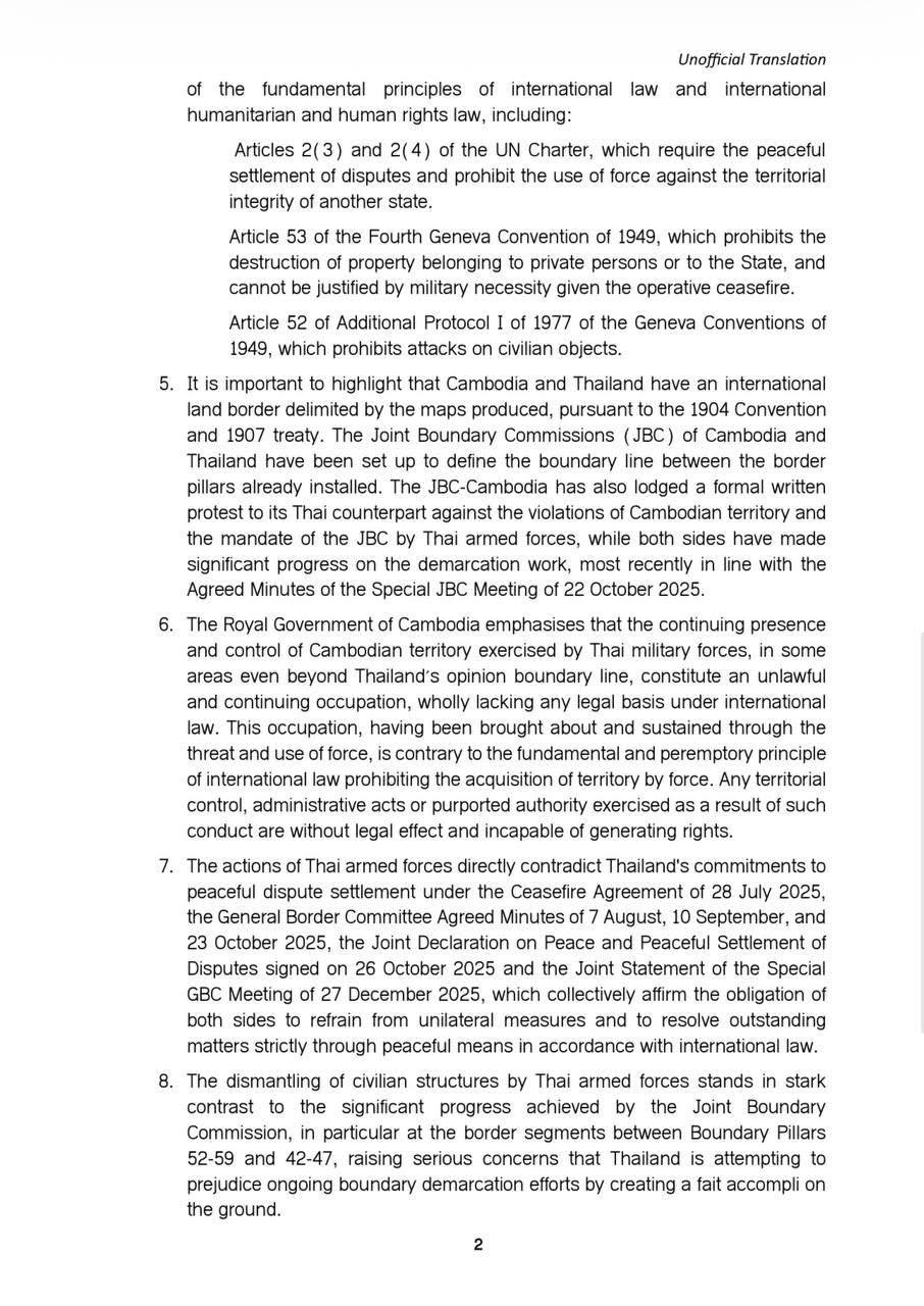 ៧. សកម្មភាពរបស់កងកម្លាំងប្រដាប់អាវុធថៃ គឺផ្ទុយស្រឡះទៅនឹងការប្តេជ្ញាចិត្តរបស់ថៃ ក្នុងការដោះស្រាយវិវាទដោយសន្តិវិធី ក្រោមការព្រមព្រៀងបទឈប់បាញ់ ថ្ងៃទី២៨ ខែកក្កដា ឆ្នាំ២០២៥ កំណត់ហេតុកិច្ចប្រជុំគណៈកម្មាធិការព្រំដែនទូទៅ ចុះថ្ងៃទី៧ ខែសីហា ថ្ងៃទី១០ ខែកញ្ញា និងថ្ងៃទី២៣ ខែតុលា ឆ្នាំ២០២៥ សេចក្តីថ្លែងការណ៍រួមស្តីពីសន្តិភាព និងដំណោះស្រាយវិវាទដោយសន្តិវិធី ដែលត្រូវបានចុះហត្ថលេខានៅថ្ងៃទី២៦ ខែតុលា ឆ្នាំ២០២៥ និងសេចក្តីប្រកាសរួមនៃកិច្ចប្រជុំពិសេសរបស់
