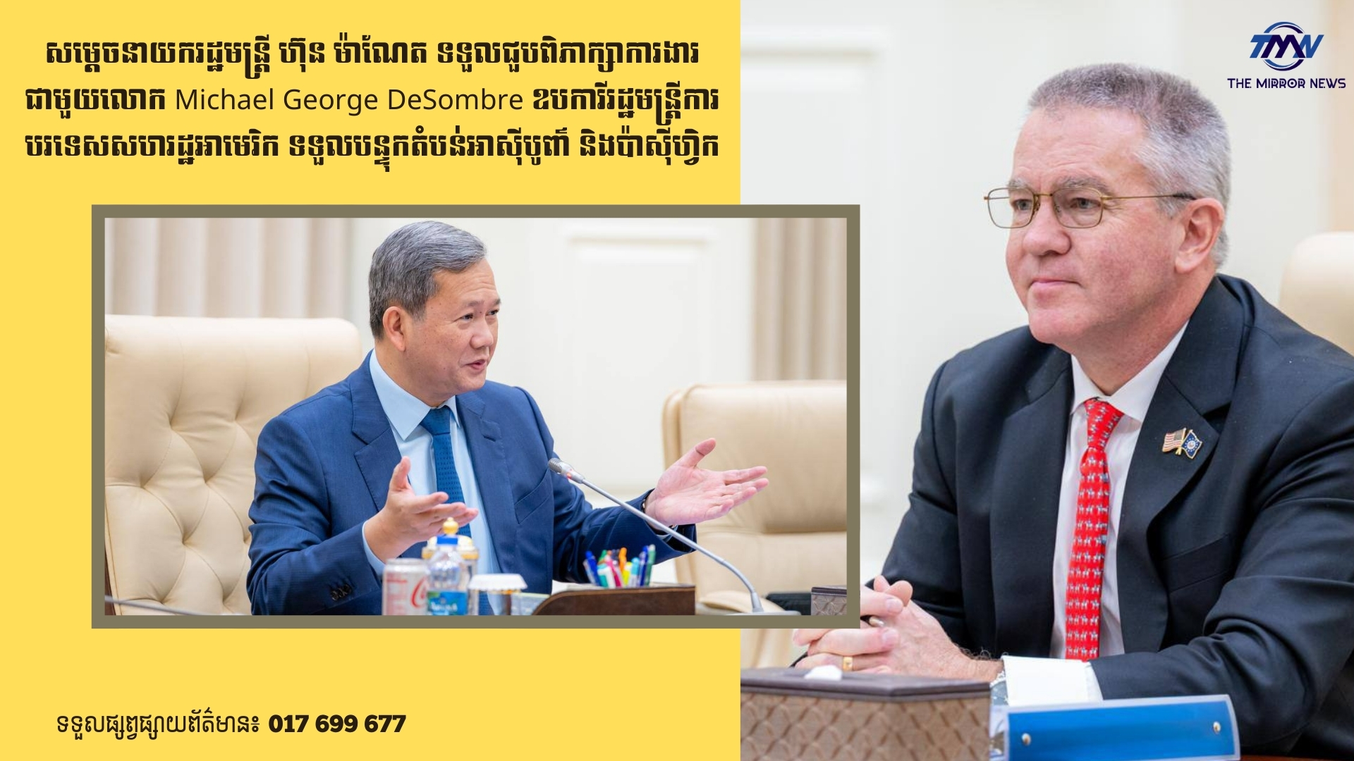 សម្តេចនាយករដ្ឋមន្ត្រី ហ៊ុន ម៉ាណែត ទទួលជួបពិភាក្សាការងារជាមួយលោក Michael George DeSombre ឧបការីរដ្ឋមន្ត្រីការបរទេសសហរដ្ឋអាមេរិក ទទួលបន្ទុកតំបន់អាសុីបូព៌ា និងប៉ាសុីហ្វិក