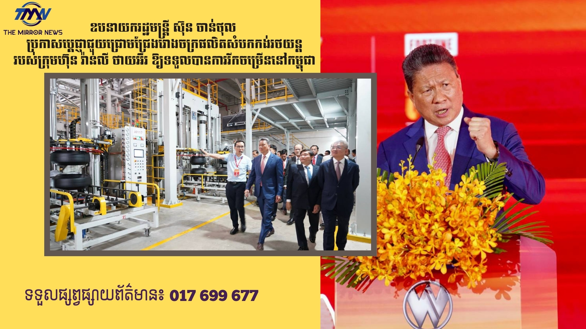 ឧបនាយករដ្ឋមន្ត្រី ស៊ុន ចាន់ថុល ប្រកាសប្តេជ្ញាជួយជ្រោមជ្រែងរោងចក្រផលិតសំបកកង់រថយន្តរបស់ក្រុមហ៊ុន វ៉ាន់លី ថាយអឺរ ឱ្យទទួលបានការរីកចម្រើននៅកម្ពុជា