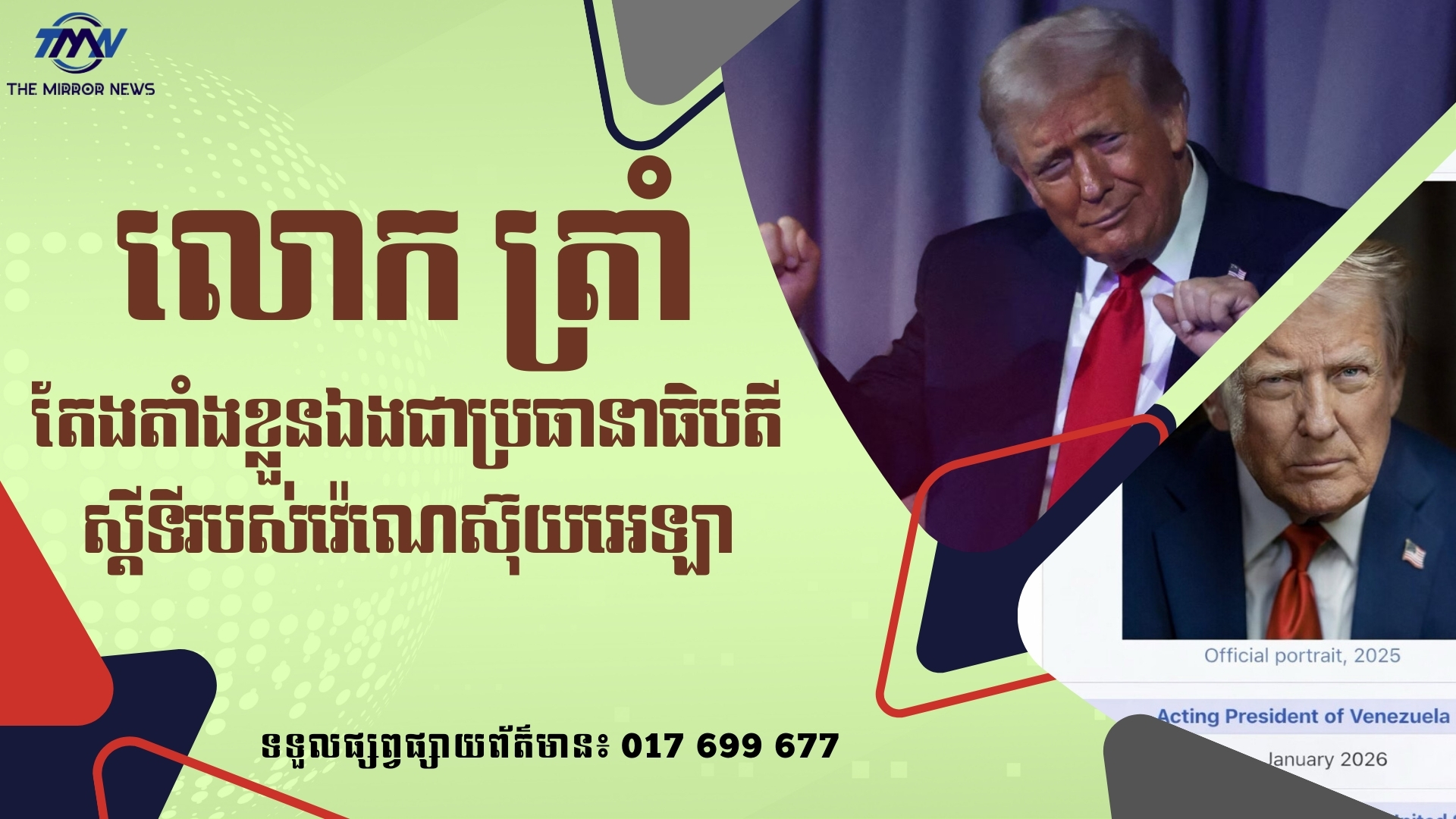 (វ៉ាស៊ីនតោន)៖ លោក ដូណាល់ ត្រាំ ប្រធានាធិបតីអាមេរិក កាលពីថ្ងៃអាទិត្យ ទី១១ ខែមករា បានបង្ហោះរូបថតមួយសន្លឹកដោយតែងតាំងខ្លួនឯងជាប្រធានាធិបតីស្ដីទីរបស់ វ៉េណេស៊ុយអេឡា បន្ទាប់ពីយោធាអាមេរិកបើកប្រតិបត្តិការចាប់ខ្លួនប្រធានាធិបតី លោក នីកូឡាស់ ម៉ាឌូរ៉ូ។ នេះបើតាមសារព័ត៌មានអាមេរិក Axios។