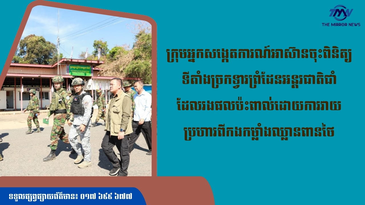 (ឧត្តរមានជ័យ)៖ ក្រុមអ្នកសង្កេតការណ៍អាស៊ាន (AOT) រួមជាមួយលោក ម៉េត មាសភក្តី អភិបាលរងខេត្តឧត្តរមានជ័យ និងឧត្តមសេនីយ៍ទោ ជា សុភ័ក្រ មេបញ្ជាការរងយោធភូមិភាគ៤ លោកអភិបាលស្រុកអន្លង់វែង និងក្រុមការងារ នាថ្ងៃទី១៤ ខែមករា ឆ្នាំ២០២៦នេះ បានអញ្ជើញចុះពិនិត្យទីតាំងច្រកទ្វារព្រំដែនអន្តរជាតិជាំ ស្ថិតនៅស្រុកអន្លង់វែង ទីតាំងសាធារណៈ ទីតាំងឯកជន និងផ្ទះសម្បែងប្រជាពលរដ្ឋជនស៊ីវិលស្លូតត្រង់ ដែលរងផលប៉ះពាល់ដោយការវាយប្រហារពីកងកម្លាំងយោធាឈ្លានពានថៃនាពេលកន្លងមក។