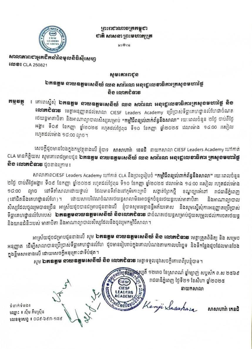 លោកនាយកសូមថ្លែងអំណរគុណយ៉ាងជ្រាលជ្រៅ ចំពោះ ឯកឧត្តម នាយឧត្តមសេនីយ៍ និងលោកជំទាវ ដែលបានអនុញ្ញាតដល់សាលា CIESF Leaders Academy ប្រើប្រាស់ទីធ្លាគេហដ្ឋានរបស់ ឯកឧត្តម នាយឧត្តមសេនីយ៍ និងលោកជំទាវ ជាចំណតរថយន្តមាតាបិតា និងអាណាព្យាបាលសិស្សសម្រាប់ “កម្មវិធីពន្យល់ពាក់ព័ន្ធនឹងសាលា” រយៈពេលចំនួន២ថ្ងៃ ចាប់ពីថ្ងៃ អង្គារ ទី០៩ ខែកញ្ញា ឆ្នាំ២០២៥ រហូតដល់ថ្ងៃពុធ ទី១០ ខែកញ្ញា ឆ្នាំ២០២៥ វេលាម៉ោង ១៤៖០០ រសៀល រហូតដល់ម៉ោង ១៨៖០០ ល្ងាច។