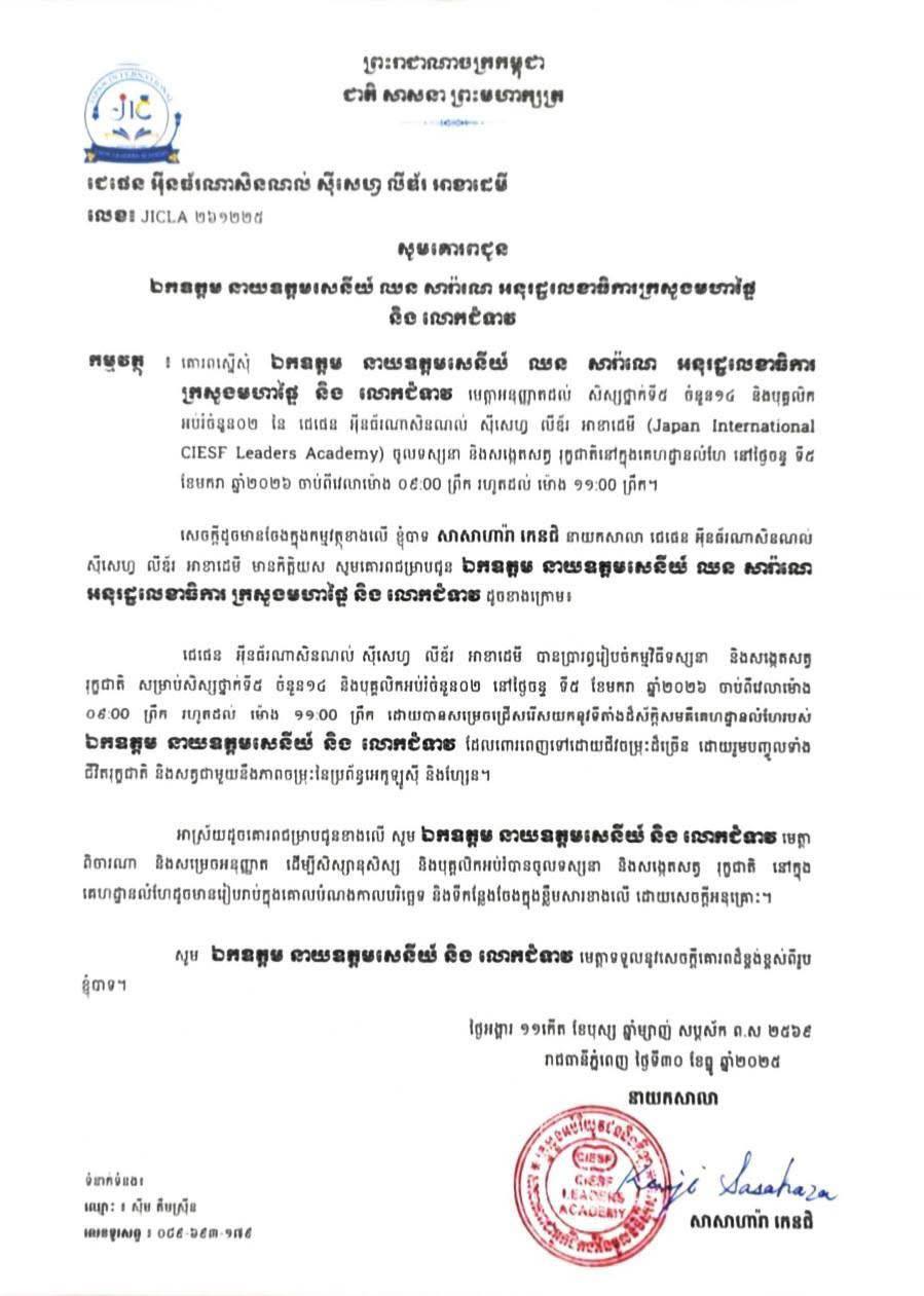 គួរជម្រាបជូនថា លោក សាសាហារ៉ា កេនជិ នាយកសាលា ជេផេន អ៊ីនធ័រណាសិនណល់ ស៊ីសេហ្វ លីឌ័រ អាខាដេមី នារសៀលថ្ងៃពុធ ទី១៤ ខែមករា ឆ្នាំ២០២៦នេះ អញ្ជើញទៅថ្លែងអំណរគុណជូនចំពោះឯកឧត្តម នាយឧត្តមសេនីយ៍ ឈន សារ៉ាណេ អនុរដ្ឋលេខាធិការក្រសួងមហាផ្ទៃ និងលោកជំទាវដល់គេហដ្ឋានផ្ទាល់តែម្ដង ក្រោយពីឯកឧត្តម នាយឧត្តមសេនីយ៍និងលោកជំទាវបានអនុញ្ញាតដល់សិស្សថ្នាក់ទី៥ ចំនួន១៤នាក់ និងបុគ្គលិកអប់រំចំនួន០២នាក់ នៃសាលា ជេជេន អ៊ីនធ័រណាសិនណល់ ស៊ីសេហ្វ លីឌ័រ អាខាដេមី (Japan International CIESF Leaders Academy) ចូលទស្សនា និងសង្កេតសត្វ រុក្ខជាតិនៅក្នុងគេហដ្ឋានរបស់ឯកឧត្តម នាយឧត្តមសេនីយ៍ និងលោកជំទាវ កាលពីថ្ងៃចន្ទ ទី៥ ខែមករា ឆ្នាំ២០២៦ ចាប់ពីវេលាម៉ោង ០៩៖០០ ព្រឹក រហូតដល់ ម៉ោង ១១៖០០ព្រឹក។