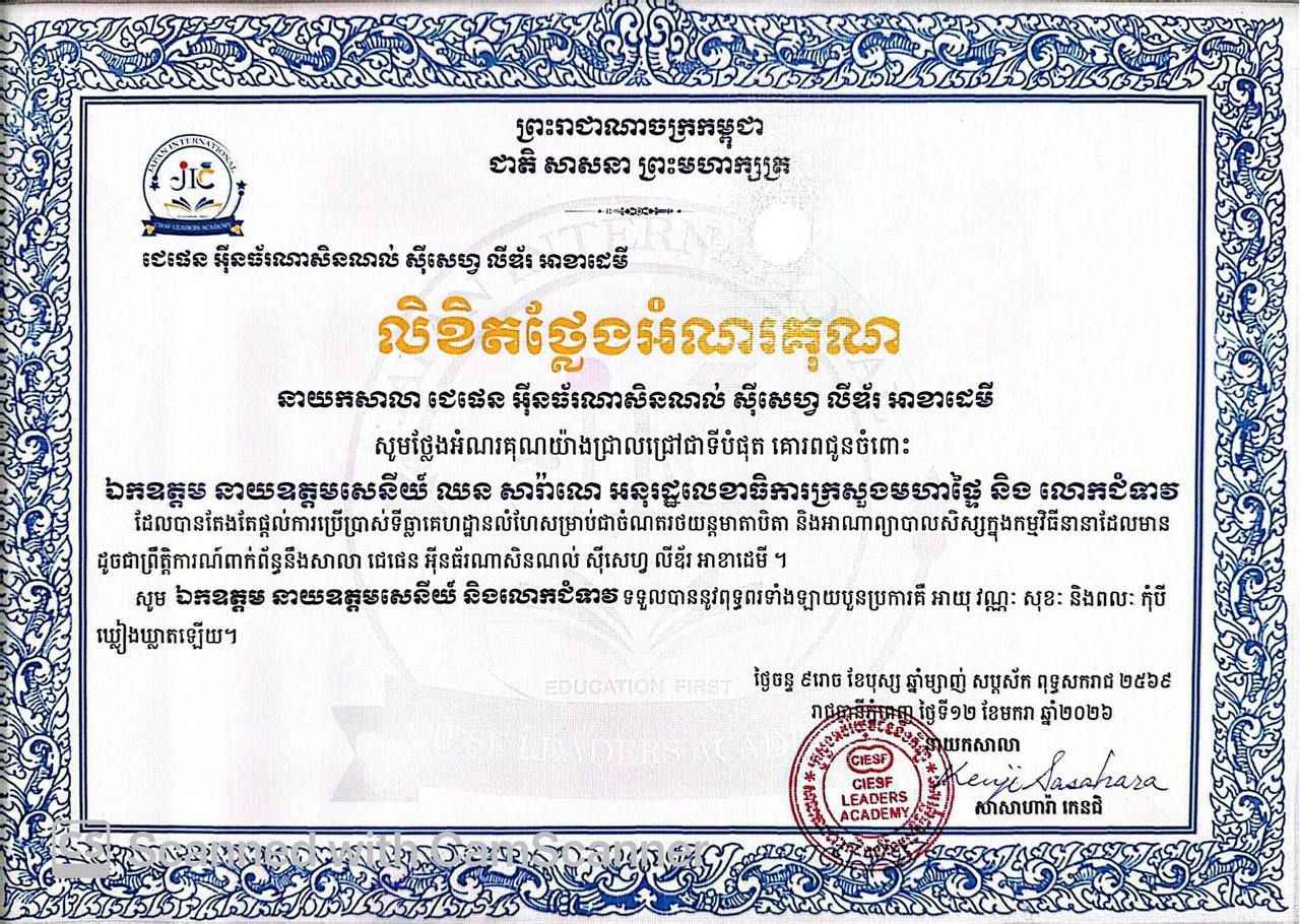 (ភ្នំពេញ)៖ លោក សាសាហារ៉ា កេនជិ នាយកសាលា ជេផេន អ៊ីនធ័រណាសិនណល់ ស៊ីសេហ្វ លីឌ័រ អាខាដេមី សូមថ្លែងអំណរគុណយ៉ាងជ្រាលជ្រៅជាទីបំផុត គោរពជូនចំពោះឯកឧត្តម នាយឧត្តមសេនីយ៍ ឈន សារ៉ាណេ អនុរដ្ឋលេខាធិការក្រសួងមហាផ្ទៃ និងលោកជំទាវ  ដែលបានតែងតែផ្តល់ការប្រើប្រាស់ទីធ្លាគេហដ្ឋានលំហែសម្រាប់ជាចំណតរថយន្តមាតាបិតា និងអាណាព្យាបាលសិស្សក្នុងកម្មវិធីនានាដែលមាន ដូចជាព្រឹត្តិការណ៍ពាក់ព័ន្ធនឹងសាលា ជេជេន អ៊ុនធ័រណាសិនណល់ ស៊ីសេហ្វ លីឌ័រ អាខាដេមី។