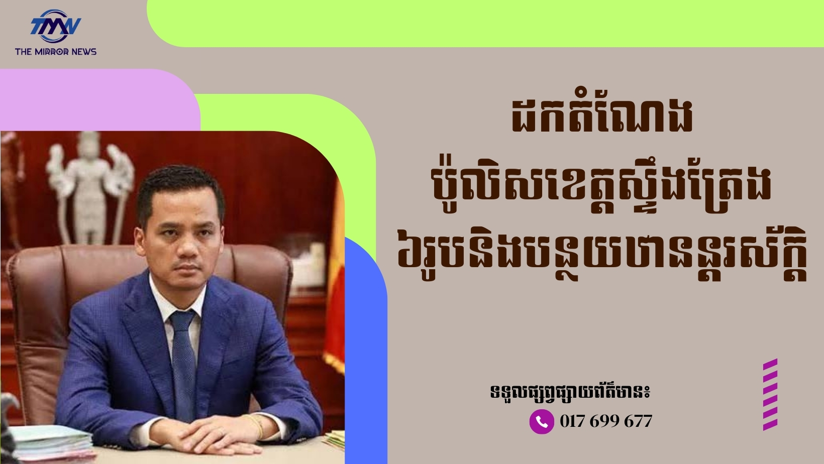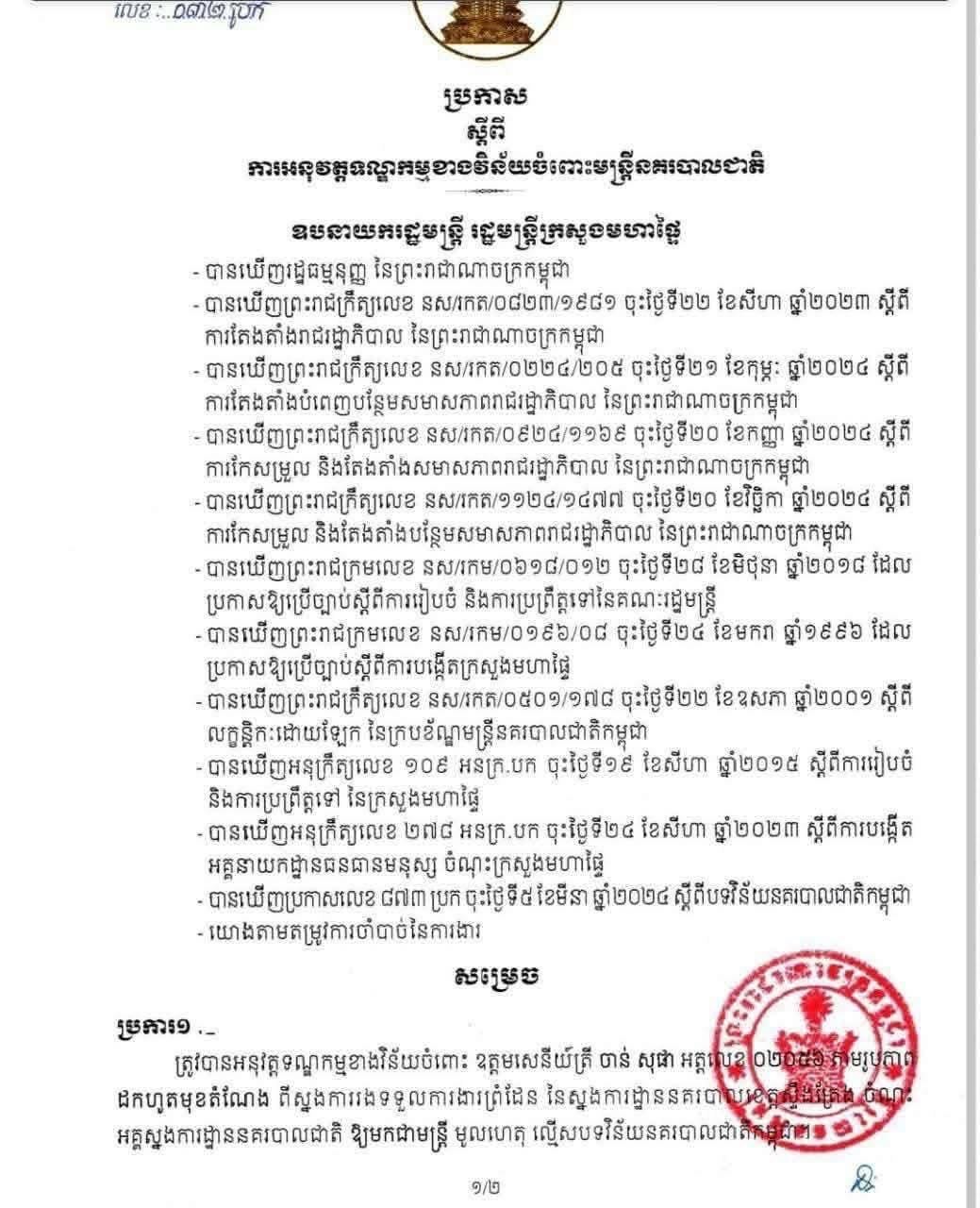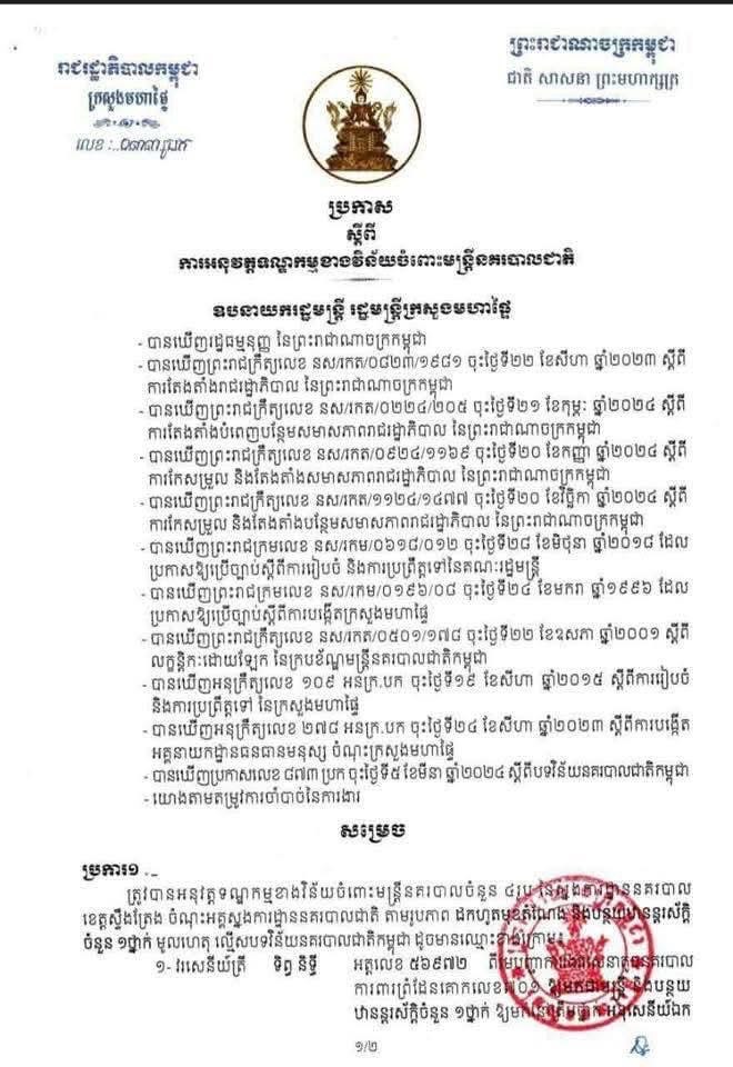 (ភ្នំពេញ)៖ រដ្ឋមន្ត្រីក្រសួងមហាផ្ទៃ ឯកឧត្ដមឧបនាយករដ្ឋមន្ត្រី ស សុខា បានសម្រេចដកហូតមុខតំណែង និងបន្ថយឋានន្តរស័ក្តិ នគរបាលបាលខេត្តស្ទឹងត្រែង ចំនួន ៦រូប ក្នុងនោះមានម្នាក់ជាឧត្តមសេនីយ៍ត្រី (ផ្កាយ១) ផងដែរ ព្រោះប្រព្រឹត្តល្មើសវិន័យនគរបាល។