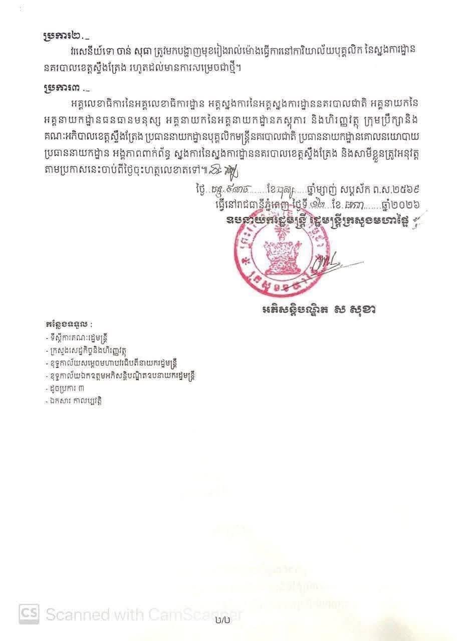 ឧបនាយករដ្ឋមន្ត្រី ស សុខា ដកតំណែងនគរបាលខេត្តស្ទឹងត្រែង៦រូប និងបន្ថយឋានន្តរស័ក្តិ