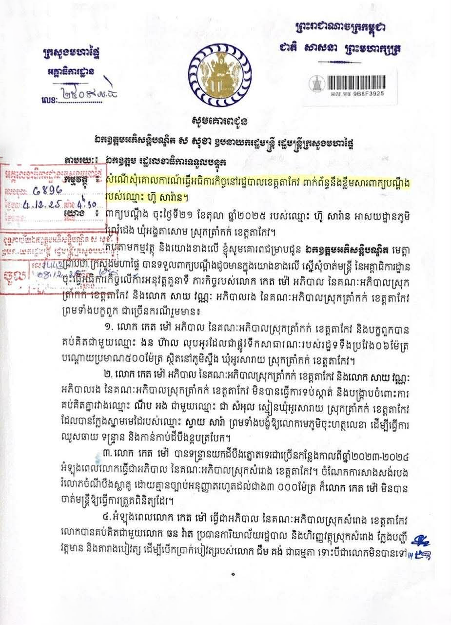 យោងតាមលិខិតសំណើចុះថ្ងៃទី២១ ខែតុលា ឆ្នាំ២០២៥ ពាក្យបណ្តឹងខាងលើបានចោទប្រកាន់លោក កេត ម៉ៅ អភិបាលស្រុកត្រាំកក់ និងលោក សាយ វណ្ណៈ អភិបាលរងស្រុកត្រាំកក់ ព្រមទាំងបក្ខពួក ពាក់ព័ន្ធនឹងអំពើមិនប្រក្រតីជាច្រើនករណីក្នុងការអនុវត្តតួនាទីរដ្ឋបាលក្នុងនោះ រួមមានការចោទប្រកាន់ថា លោក កេត ម៉ៅ និងបក្ខពួកបានគប់គិតជាមួយបុគ្គលឯកជនម្នាក់ ដើម្បីលុបអូរដែលជាផ្លូវទឹកសាធារណៈរបស់រដ្ឋ មានទទឹងប្រវែងប្រមាណ ៦ម៉ែត្រ និងបណ្តោយប្រមាណ៥០០ម៉ែត្រ ស្ថិតនៅភូមិស្ទឹង ឃុំអូរសារាយ ស្រុកត្រាំកក់។ ពាក្យបណ្តឹងក៏បានលើកឡើងថា ថ្នាក់ដឹកនាំស្រុកមិនបានទប់ស្កាត់ និងបង្ក្រាបការគប់គិតគ្នារវាងមន្ត្រីឃុំ និងបុគ្គលឯកជន ក្នុងការក្លែងស្នាមមេដៃ បង្ខំឱ្យមេភូមិចុះហត្ថលេខា និងធ្វើការឈូសឆាយ ទន្ទ្រាន និងកាន់កាប់ដីបឹងខ្ពបត្របែកដោយខុសច្បាប់។