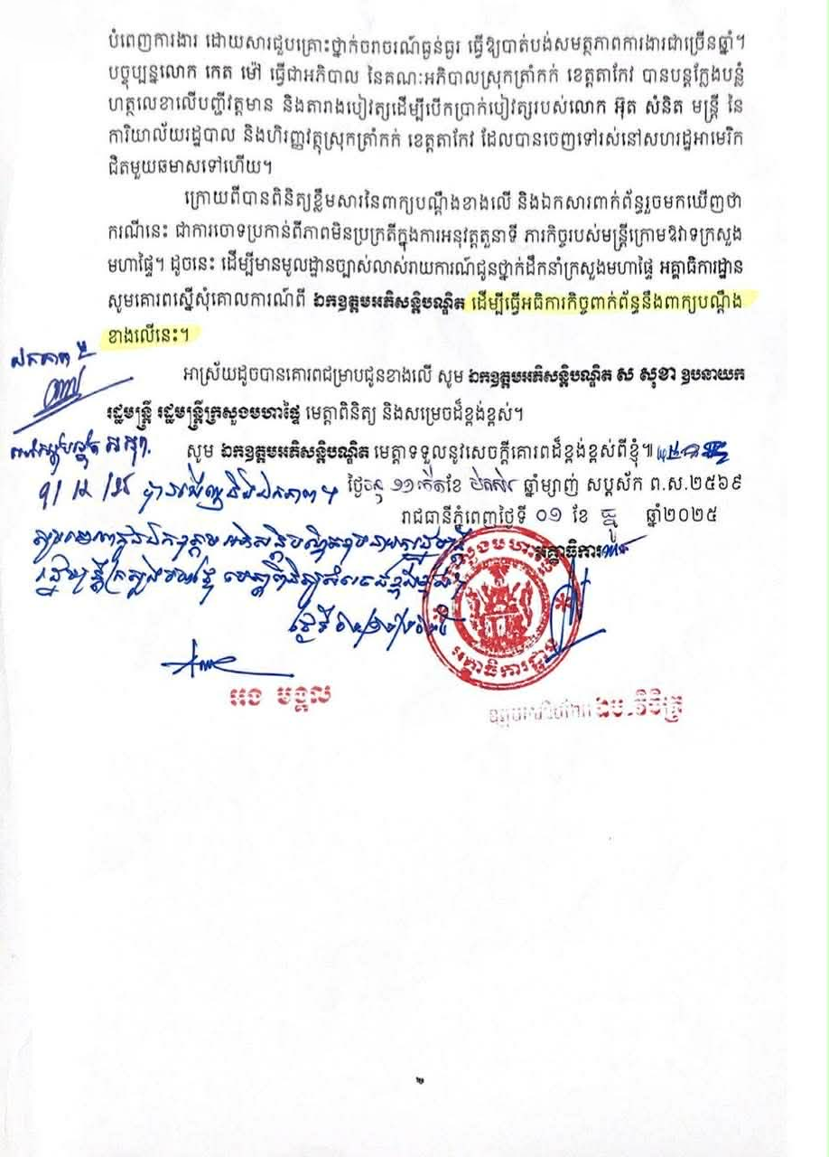 ពាក្យបណ្ដឹង ក៏បានអះអាងទៀតថា បច្ចុប្បន្ននៅស្រុកត្រាំកក់ លោក កេត ម៉ៅ នៅតែបន្តគប់គិតក្លែងបន្លំហត្ថលេខាលើបញ្ជីវត្តមាន និងតារាងបៀវត្សបើកប្រាក់បៀវត្សមន្ត្រីឈ្មោះ អ៊ុត សំនិត ដែលបានចាកចេញទៅសហរដ្ឋអាមេរិកជិតមួយឆមាស (០៣-០៨/២៥) និងកំពុងបន្តទៀតនៅពេលបច្ចុប្បន្ន។