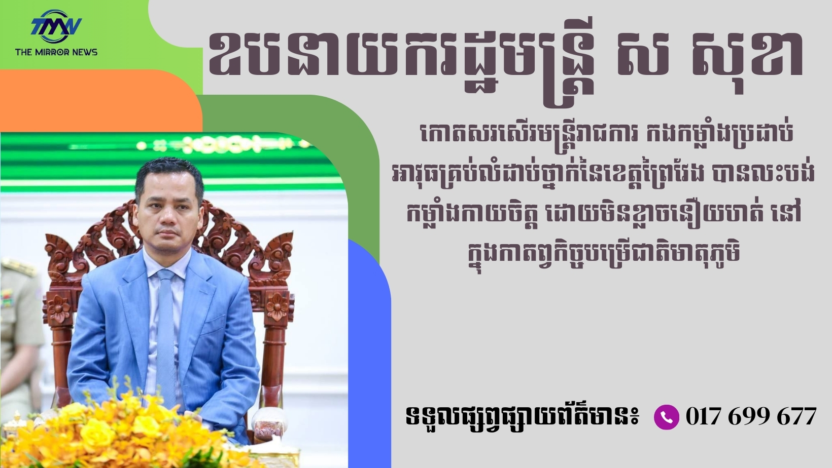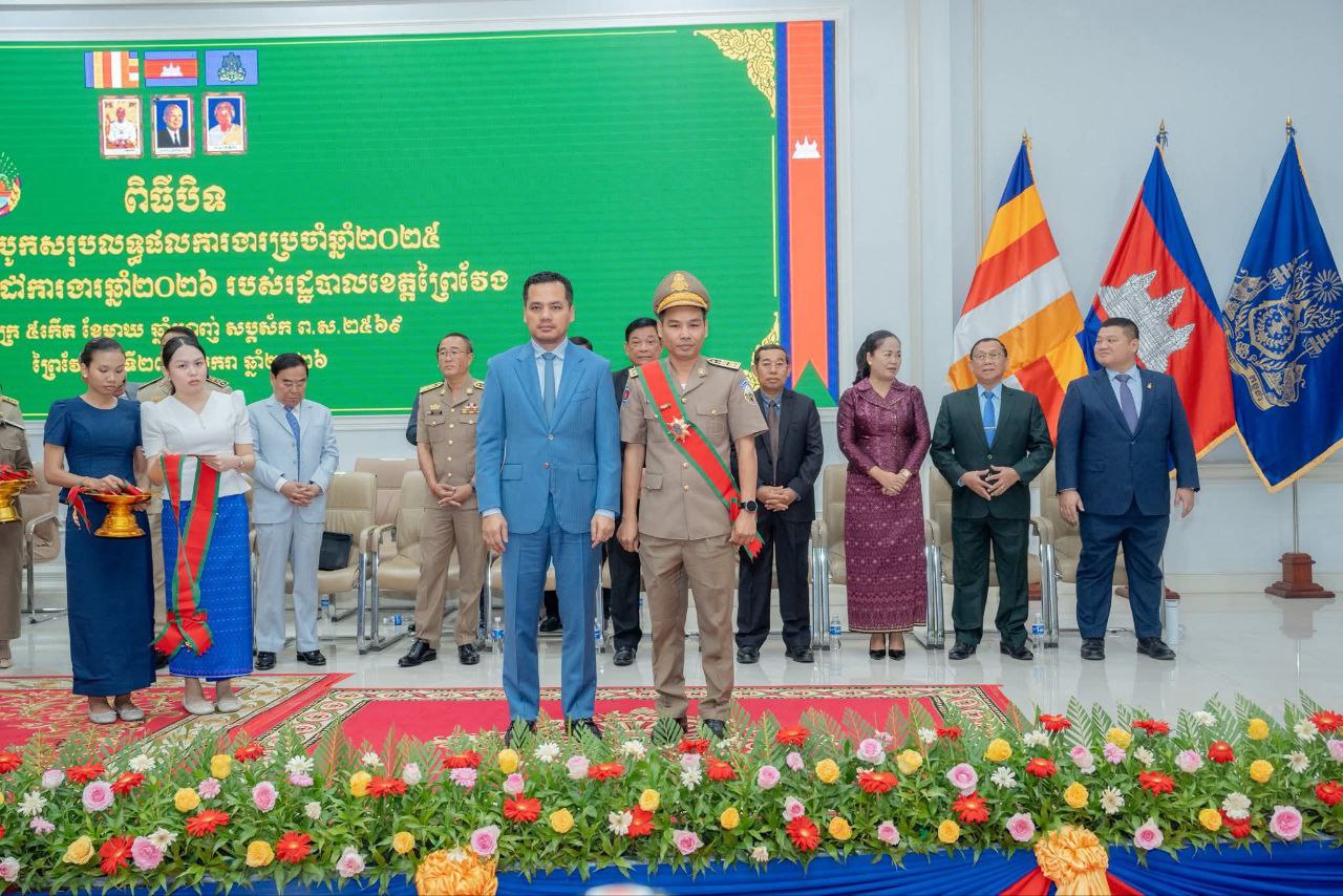ការកោតសរសើររបស់លោកអភិសន្តិបណ្ឌិត ស សុខា ឧបនាយករដ្ឋមន្ត្រី រដ្ឋមន្ត្រីក្រសួងមហាផ្ទៃ និងជាប្រធានក្រុមការងាររាជរដ្ឋាភិបាលចុះមូលដ្ឋានខេត្តព្រៃវែង នៅព្រឹកថ្ងៃទី២៣ ខែមករា ឆ្នាំ២០២៦ ក្នុងឱកាសអញ្ជើញបិទសន្និបាតបូកសរុបលទ្ធផលការងារប្រចាំឆ្នាំ២០២៥ និងលើកទិសដៅការងារឆ្នាំ២០២៦ របស់រដ្ឋបាលខេត្តព្រៃវែង។