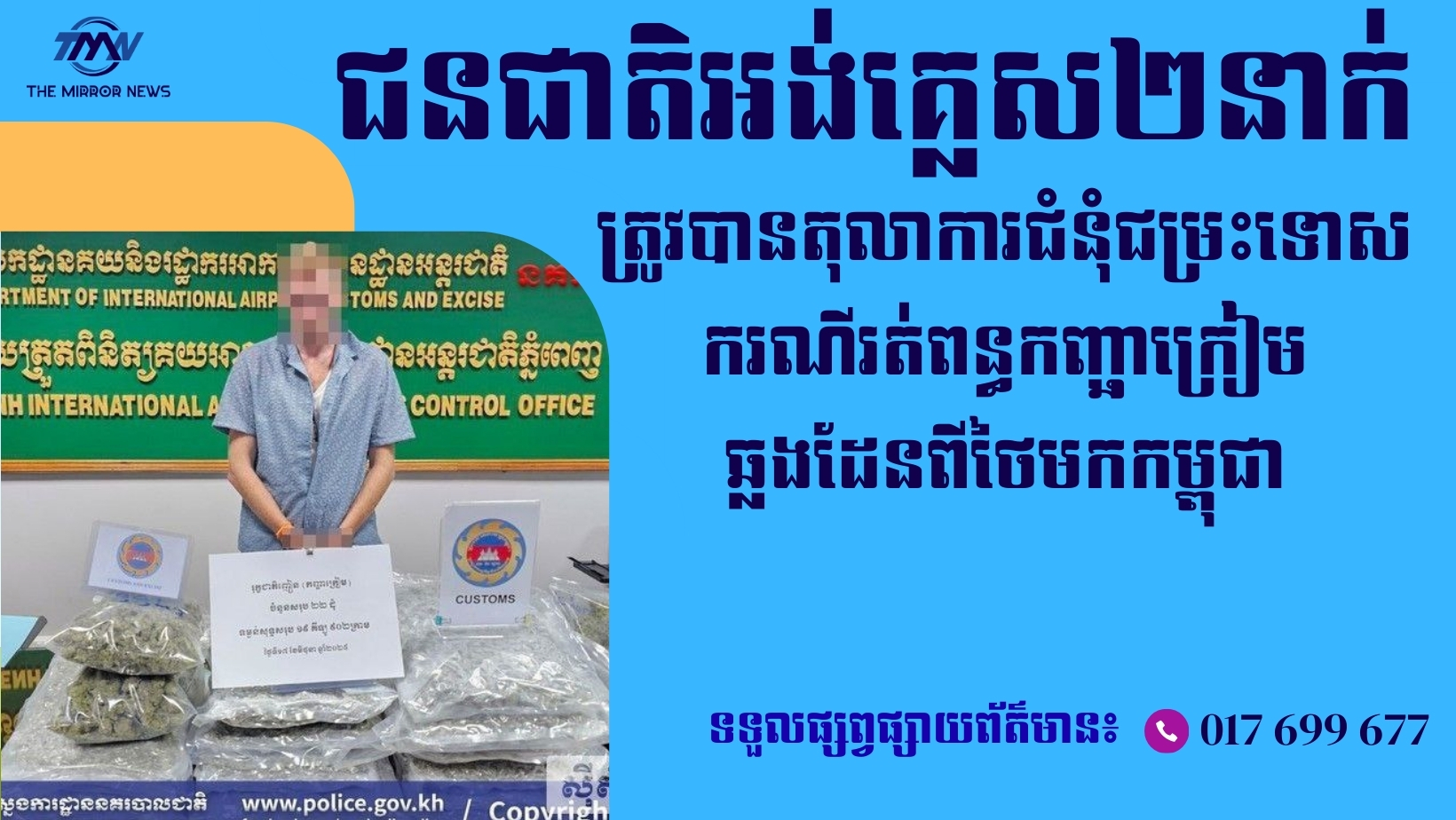 គួរបញ្ជាក់ថា ប្រតិបត្តិការនេះ​ ធ្វើឡើងកាលពីថ្ងៃទី១៧ ខែមិថុនា ដោយអនុវត្ដតាមបទបញ្ជានាយឧត្តមសេនីយ៍ ស ថេត អគ្គស្នងការនគរបាលជាតិ កម្លាំងជំនាញនៃមន្ទីរប្រឆាំងគ្រឿងញៀន សហការជាមួយសមត្ថកិច្ចគយ និងរដ្ឋាករប្រចាំអាកាសយានដ្ឋានអន្តរជាតិភ្នំពេញ និងសម្របសម្រួលនីតិវិធីពីលោក ស៊ិត វណ្ណៈ ព្រះរាជអាជ្ញារង នៃអយ្យការអមសាលាដំបូងរាជធានីភ្នំពេញ បង្ក្រាបករណីដឹកជញ្ជូនកញ្ឆាក្រៀមឆ្លងដែន តាមផ្លូវអាកាស នៅអាកាសយានដ្ឋានអន្តរជាតិភ្នំពេញ ធ្វើការចាប់ខ្លួនជនល្មើសម្នាក់ សញ្ជាតិអង់គ្លេសអាយុ៤១ឆ្នាំ និងម្នាក់ទៀតឈ្មោះ Jam អាយុ២៨ឆ្នាំ។