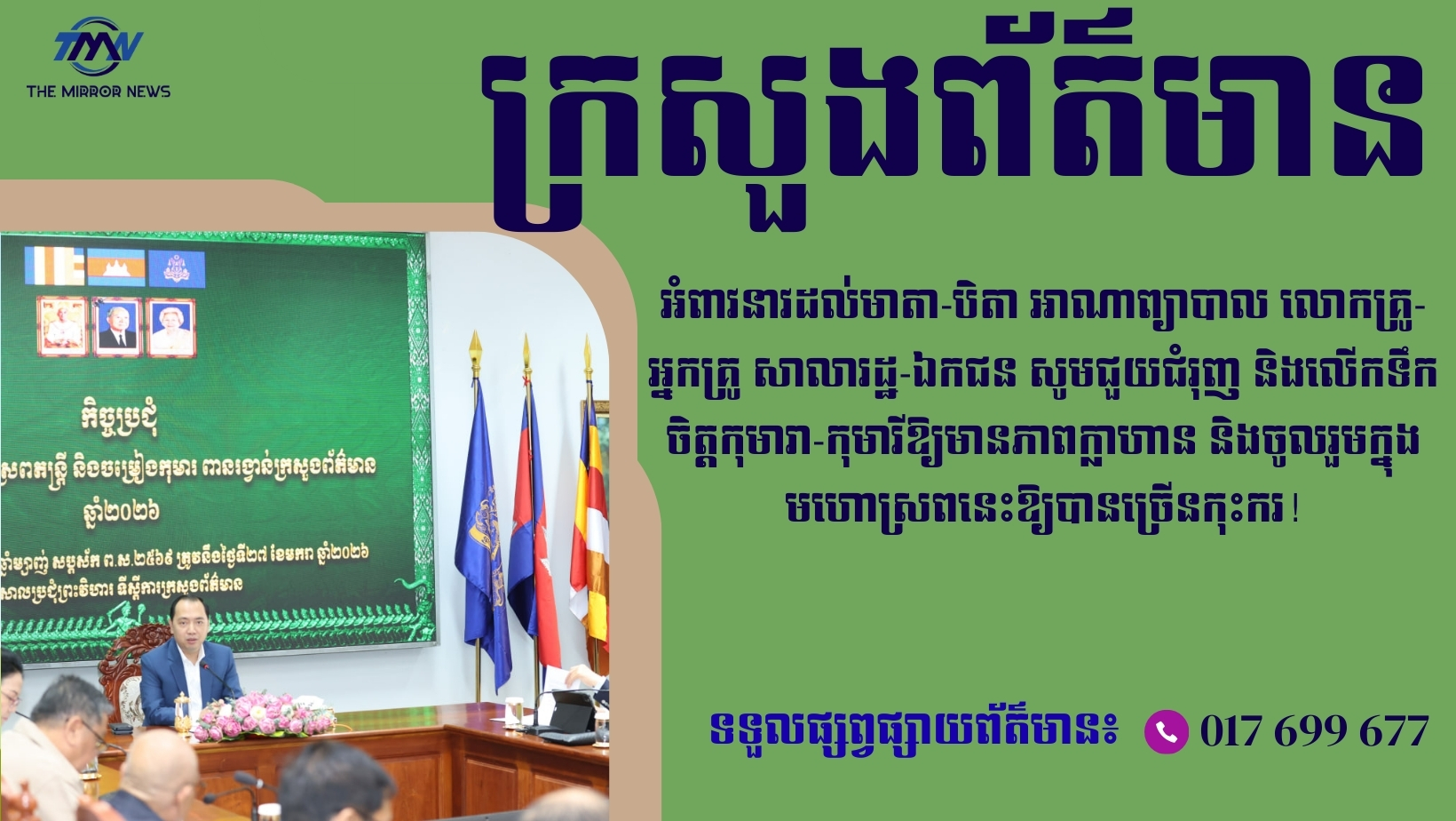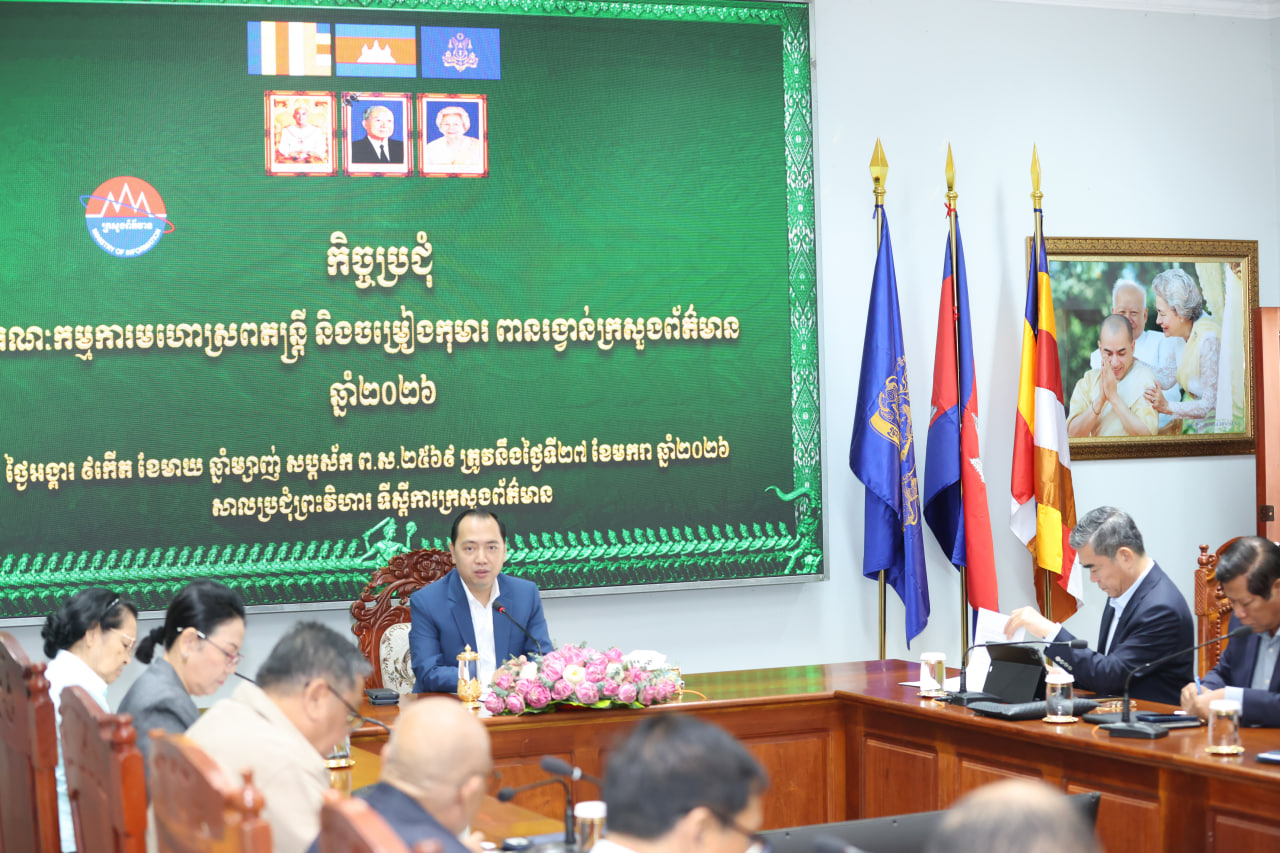(ភ្នំពេញ)៖ នៅព្រឹកថ្ងៃទី២៧ ខែមករា ឆ្នាំ២០២៦ លោក នេត្រ ភក្ត្រា រដ្ឋមន្ត្រីក្រសួងព័ត៌មាន បានដឹកនាំកិច្ចប្រជុំលើកដំបូង គណៈកម្មការមហោស្រពតន្ត្រី និងចម្រៀងកុមារពានរង្វាន់ក្រសួងព័ត៌មានឆ្នាំ២០២៦ ដែលគ្រោងធ្វើនៅចុងខែមេសា ឆ្នាំ២០២៦ ខាងមុខនេះ ក្នុងគោលបំណងលើកកម្ពស់ការអប់រំកុមារតាមរយៈសិល្បៈតន្ត្រី និងចម្រៀង ដោយជំរុញឱ្យកុមារចូលរួមបង្ហាញទេពកោសល្យ ភាពច្នៃប្រឌិត និងសមត្ថភាពសិល្បៈរបស់ខ្លួន តាមរយៈបទចម្រៀង ថ្មីៗ ដែលមានអត្ថន័យអប់រំ ស្របតាមវ័យ និងសង្គមកម្ពុជា។
