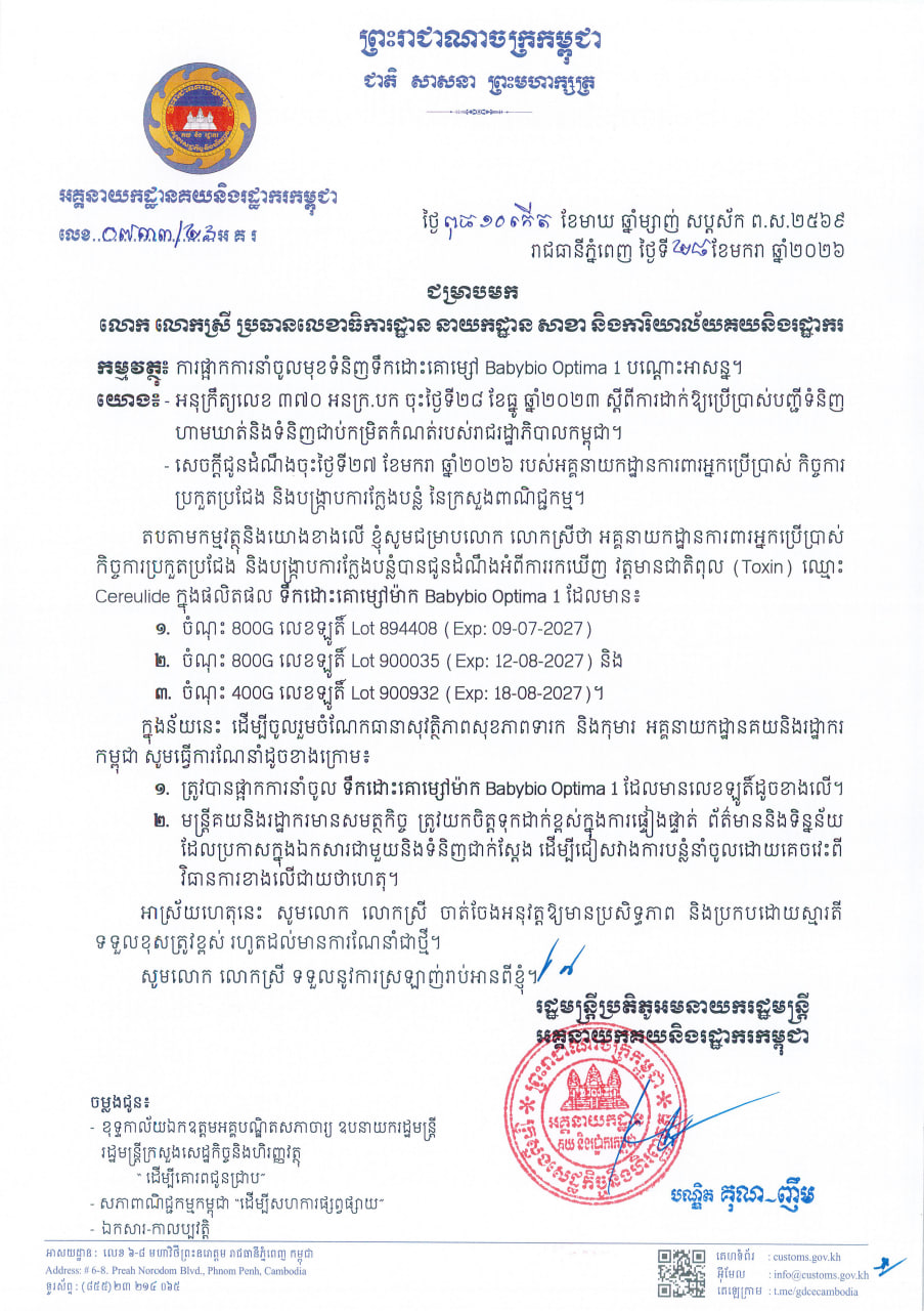 លិខិតរបស់លោកបណ្ឌិតបានបញ្ជាក់ថា ដើម្បីចូលរួមចំណែកធានាសុវត្ថិភាពសុខភាពទារក និងកុមារ អគ្គនាយកដ្ឋានគយនិងរដ្ឋាករកម្ពុជា សូមធ្វើការណែនាំដូចខាងក្រោម៖ *១. ត្រូវបានផ្អាកការនាំចូល ទឹកដោះគោម្សៅម៉ាក Babybio Optima 1 ដែលមានលេខឡូត៏ដូចខាងលើ។