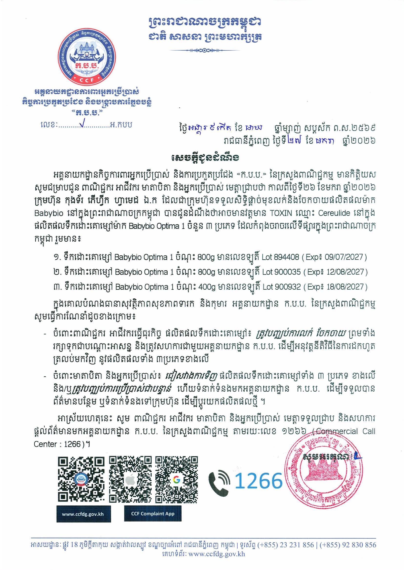 (ភ្នំពេញ)៖ រដ្ឋមន្ត្រីប្រតិភូអមនាយករដ្ឋមន្ត្រី និងជាអគ្គនាយកនៃអគ្គនាយកដ្ឋានគយ និងរដ្ឋាករកម្ពុជា លោកបណ្ឌិត គុណ ញឹម បានចេញសេចក្តីជូនដំណឹងប្រកាសឱ្យផ្អាកការនាំចូលមុខទំនិញទឹកដោះគោម្សៅ Babybio Optima 1 បណ្តោះអាសន្ន បន្ទាប់ពីអគ្គនាយកដ្ឋានការពារអ្នកប្រើប្រាស់កិច្ចការប្រកួតប្រជែង និងបង្ក្រាបការក្លែងបន្លំ បានជូនដំណឹងអំពីការរកឃើញ វត្តមានជាតិពុល (Toxin) ឈ្មោះ Cereulide ក្នុងផលិតផល ទឹកដោះគោនេះ។