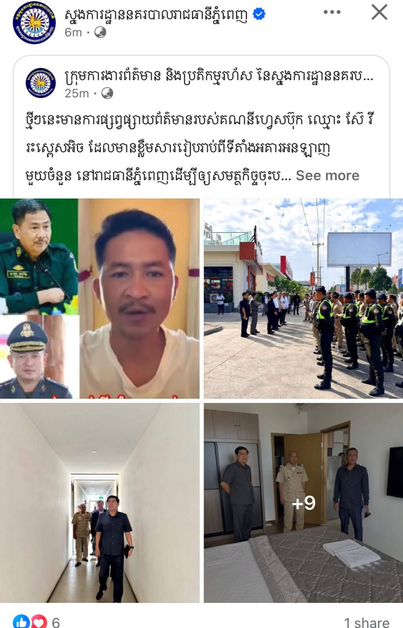 (ភ្នំពេញ)៖ ថ្មីៗនេះមានការផ្សព្វផ្សាយព័ត៌មានរបស់គណនីហ្វេសប៊ុក ឈ្មោះ ស៊ែ វីរះស្ពេសអិច ដែលមានខ្លឹមសាររៀបរាប់ពីទីតាំងអគារអនឡាញមួយចំនួន នៅរាជធានីភ្នំពេញដើម្បីឲ្យសមត្ថកិច្ចចុះបង្រ្កាប។  ក្រុមការងារព័ត៌មាននិងប្រតិកម្មរហ័សនៃស្នងការដ្ឋាននគរបាលរាជធានីភ្នំពេញ សូមបំភ្លឺជូនដល់សាធារណជនមេត្តាជ្រាបថាៈ ដោយទីតាំងអគារដែលគណនីហ្វេសប៊ុក ឈ្មោះ ស៊ែ វីរះស្ពេសអិច បានរៀបរាប់ រួមមាន៖ *១- អគារ the bridge (ខណ្ឌចំការមន)*២- អគារ Marry Time (ខណ្ឌមានជ័យ)*៣- អគារPNN (ខណ្ឌជ្រោយចង្វារ)*៤- អគារស្កាយឡាញ ក្បែរផ្សារអូឬស្សី (ខណ្ឌ៧មករា)*៥- អគារមានរូបម្កុដិ (ខណ្ឌដូនពេញ)*៦-អគារស្កាយទ្រី (ខណ្ឌឫស្សីកែវ)។ នេះបើតាមប្រភពពីក្រុមការងារព័ត៌មាននិងប្រតិកម្មរហ័សនៃស្នងការដ្ឋាននគរបាលរាជធានីភ្នំពេញដែលអង្គភាព The Mirror News ទទួលបាននៅថ្ងៃទី៣ ខែកុម្ភៈ ឆ្នាំ២០២៦នេះ។
