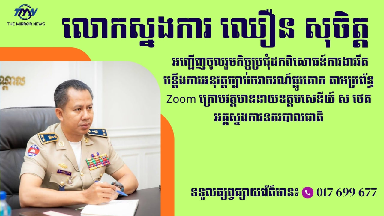 លោកឧត្ដមសេនីយ៍ស្នងការ ឈឿន សុចិត្ត អញ្ជើញចូលរួមកិច្ចប្រជុំដកពិសោធន៍ការងាររឹតបន្តឹងការអនុវត្តច្បាប់ចរាចរណ៍ផ្លូវគោក តាមប្រព័ន្ធ Zoom ក្រោមវត្តមាននាយឧត្ដមសេនីយ៍ ស ថេត អគ្គស្នងការនគរបាលជាតិ