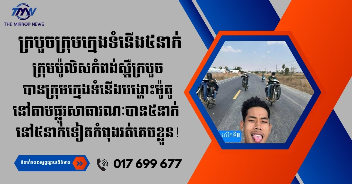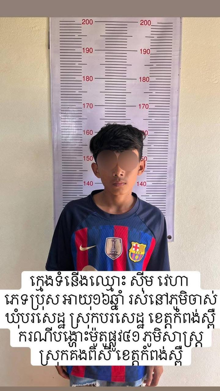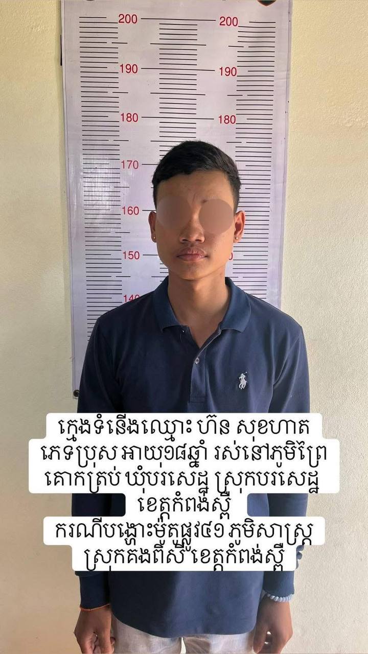 (កំពង់ស្ពឺ​)៖ ក្រោយបែកធ្លាយវីដេអូតាមប​ណ្ដាញសង្គមហ្វេសប៊ុក​ ការប​ង្អួតអំ​ពីស​កម្មភាពក្រុមក្មេងទំនេីងដែលបង្ហោះម៉ូតូតាមផ្លូវជាតិលេ​ខ៤​១​ ក្នុងទឹកដីស្រុកគងពិសី​ កម្លាំងអធិការ​ដ្ឋាននគរបាលស្រុកគងពិសីសហការជាមួយអធិការ​ដ្ឋាននគរបាលស្រុកបសេដ្ឋ​ធ្វេីការស្រាវជ្រាវឈានទៅឃាត់ខ្លួនមនុស្សចំនួន​៥នាក់​ ចំណោមបក្ខពួក​១០​នាក់​ (៥នាក់គេចខ្លួន​ និងម្នាក់ព្យួរសេរ៉ូម)​៖ *១.ឈ្មោះ ហូ ម៉េងហុង ភេទប្រុ​ស អាយុ១៧ឆ្នាំ នៅភូមិបឹងស្តុក ស្រុកបសេដ្ឋ (អ្នកថតរូប) ឃាត់ខ្លួន។ *២. ឈ្មោះ ស៊ីម វេហា ភេទប្រុ​ស អាយុ១៦ឆ្នាំ នៅភូមិចាស់ ឃុំប​សេដ្ឋ ស្រុកបរសេដ្ឋ ឃាត់ខ្លួន។ *៣. ឈ្មោះ ហ៊ន សុខហាត ភេ​ទ អាយុ១៨ឆ្នាំ នៅភូមិព្រៃគោកត្រប់ ឃុំបរសេដ្ឋ ឃាត់ខ្លួន។ *៤. ឈ្មោះ លីម ស័ក្ករាជ្យ ភេទប្រុស អាយុ១៧ឆ្នាំ នៅភូមិសាឡាំ ឃុំពោធិ៍ម្រាល ស្រុកបសេដ្ឋ ឃាត់ខ្លួន។*៥. ឈ្មោះ អ៊ុល ដារ៉ាប់ ភេទប្រុ​ស អាយុ១៧ឆ្នាំ នៅភូមិគូកត្រប់ ស្រុ​កបរសេដ្ឋ (កំពុងព្យាបាលជម្ងឺ គ្រុនឈាម)​។