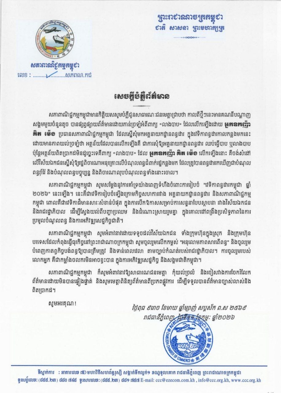 សភាពាណិជ្ជកម្មកម្ពុជាក៏សូមអំពាវនាវឱ្យសាធារណជនមេត្តាកុំយល់ច្រលំ និងចៀសវាងការចែករំលែកព័ត៌មានដោយមិនបានផ្ទៀងផ្ទាត់ និងសូមមេត្តាពិនិត្យព័ត៌មានពីប្រភពផ្លូវការ ដើម្បីទទួលបានព័ត៌មានច្បាស់លាស់និងពិតប្រាកដ៕