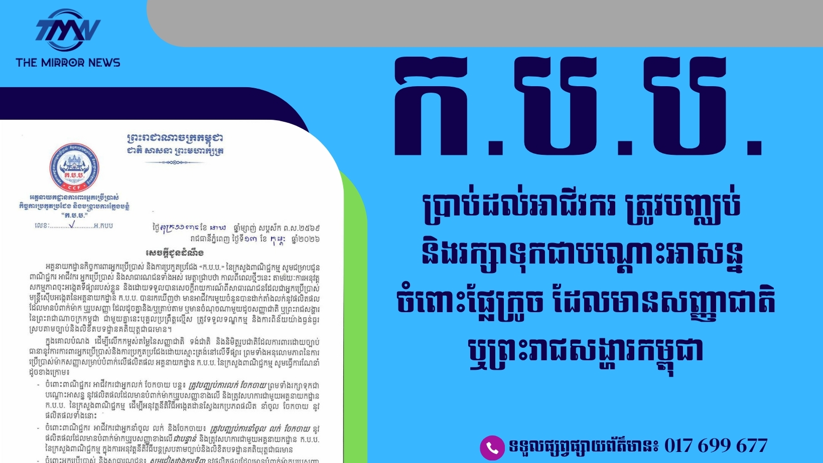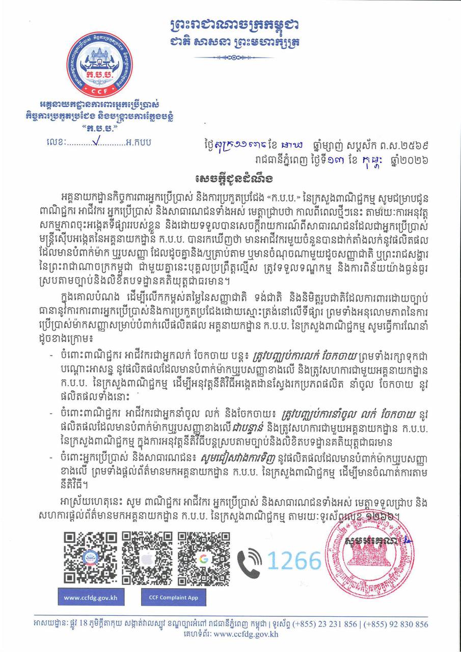 សេចក្តីជូនដំណឹង បានឲ្យដឹងថា កាលពីពេលថ្មីៗនេះ តាមរយៈការអនុវត្ត សកម្មភាពចុះអង្កេតទីផ្សាររបស់ខ្លួន និងដោយទទួលបានសេចក្តីរាយការណ៍ ពីសាធារណជន ដែលជាអ្នកប្រើប្រាស់ មន្ត្រីស៊ើបអង្កេត នៃអគ្គនាយកដ្ឋាន ក.ប.ប. បានរកឃើញថា មានអាជីវករមួយចំនួន បានដាក់តាំងលក់នូវផលិតផល ដែលមានបំពាក់ម៉ាក ឬរូបសញ្ញា ដែលដូចគ្នា និង/ឬត្រាប់តាម ឬមានចំណុចណាមួយ ដូចសញ្ញាជាតិ ឬព្រះរាជសង្ហារ នៃព្រះរាជាណាចក្រកម្ពុជា។