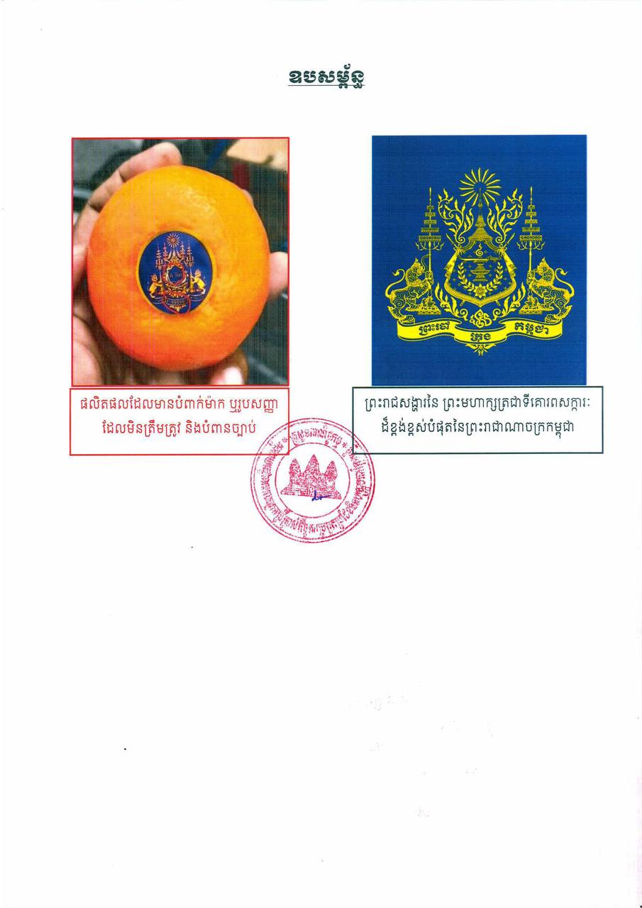 (ភ្នំពេញ)៖ អគ្គនាយកដ្ឋានកិច្ចការពារអ្នកប្រើប្រាស់ និងការប្រកួតប្រជែង ក.ប.ប. នៃក្រសួងពាណិជ្ជកម្ម បានប្រាប់ដល់ដល់អាជីវករ ទាំងអ្នកនាំចូល និងអ្នកលក់បន្ដ ត្រូវបញ្ឈប់ និងរក្សាទុកជាបណ្តោះអាសន្ន ចំពោះផ្លែក្រូច ដែលមានសញ្ញាជាតិ ឬព្រះរាជសង្ហារ នៃព្រះរាជាណាចក្រកម្ពុជា។