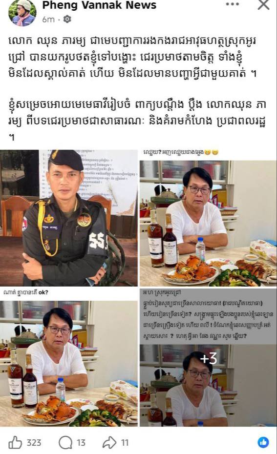 បើយោងតាមការបង្ហោះសាររបស់លោក ផែង វណ្ណៈ នៅលើបណ្ដាញសង្គមបានបញ្ជាក់ឱ្យដឹងថា «លោក​ ឈុន​ ភារម្យ​ ជា​មេ​បញ្ជាការ​រង​កងរាជ​អាវុធ​ហត្ថ​ស្រុក​អូរ​ជ្រៅ​ បាន​យករូបថត​ខ្ញុំ​ទៅ​បង្ហោះ​ ជេរប្រមាថ​តាមចិត្ត​ ទាំងខ្ញុំ​មិនដែល​ស្គាល់​គាត់​ ហេីយ​ មិនដែល​មាន​បញ្ហា​អ្វី​ជាមួយ​គាត់​។ ខ្ញុំ​សម្រេច​អោយ​មេ​មេធាវី​រៀបចំ​ពាក្យបណ្ដឹង​ប្ដឹង​លោក​ ឈុន​ ភារម្យ​ ពីបទ​ជេរ​ប្រមាថ​ជាសាធារណៈ​ និង​គំរាមកំហែង​ ប្រជាពលរដ្ឋ​»។
