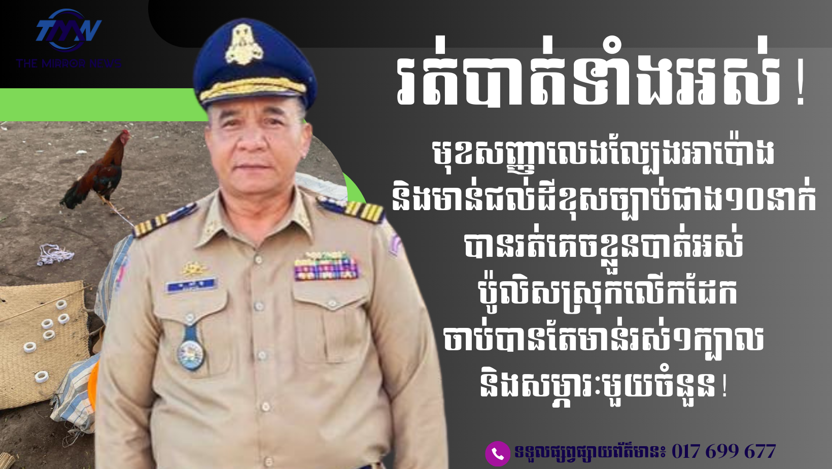 (កណ្ដាល)៖ កម្លាំងនគរបាលស្រុកលើកដែកដឹកនាំដោយលោកវរសេនីយ៍ឯក អាំ ធូ អធិការនគរបាលស្រុកមិនអាចចាប់ក្រុមអ្នកញៀបល្បែងខុសច្បាប់បានសូម្បីតែ១នាក់ក្នុងចំណោមមុខសញ្ញាលេងល្បែងអាប៉ោងនិងមាន់ជល់ដីខុសច្បាប់ជាង១០នាក់ ចាប់បានតែមាន់រស់១ក្បាលនិងសម្ភារៈមួយចំនួននៅថ្ងៃអង្គារ ទី១៧ ខែកុម្ភៈឆ្នាំ២០២៦នេះ នៅចំណុចក្នុងព្រៃស្វាព្រៀម ស្ថិតក្នុងភូមិ តាហ៊ីង ឃុំព្រែកដាច់ ស្រុកលើកដែក ខេត្តកណ្តាល។ នេះបើតាមរបាយការណ៍របស់លោកវរសេនីយ៍ឯក អាំ ធូ អធិការនគរបាលស្រុកលើកដែកដែលអង្គភាពព័ត៌មាន The Mirror News ទទួលបាននៅថ្ងៃទី១៧ ខែកុម្ភៈ ឆ្នាំ២០២៦នេះ។
