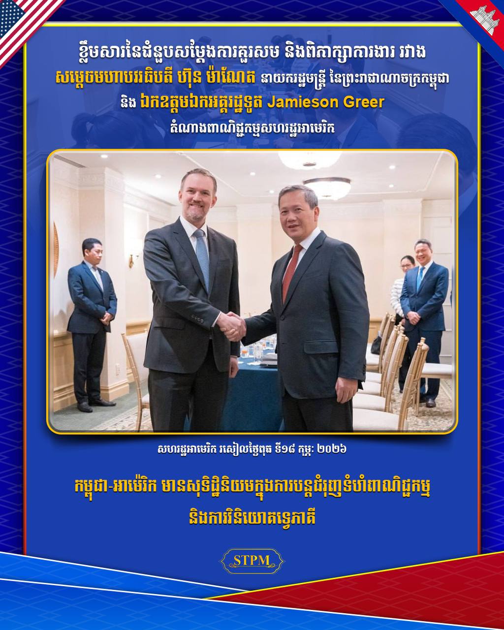 (អាម៉េរិក)៖ នារសៀលថ្ងៃទី១៨ ខែកុម្ភៈ ឆ្នាំ២០២៦, សម្ដេចមហាបវរធិបតី ហ៊ុន ម៉ាណែត នាយករដ្ឋមន្ត្រី នៃព្រះរាជាណាចក្រកម្ពុជា បានជួបពិភាក្សាការងារជាមួយ ឯកឧត្ដមឯកអគ្គរដ្ឋទូត Jamieson Greer តំណាងពាណិជ្ជកម្មសហរដ្ឋអាម៉េរិក ក្នុងឱកាសនៃការដឹកនាំគណៈប្រតិភូរាជរដ្ឋាភិបាលកម្ពុជាចូលរួមកិច្ចប្រជុំលើកដំបូងនៃក្រុមប្រឹក្សាសន្តិភាព (Board of Peace) នៅរដ្ឋធានីវ៉ាស៊ីនតោន សហរដ្ឋអាម៉េរិក។