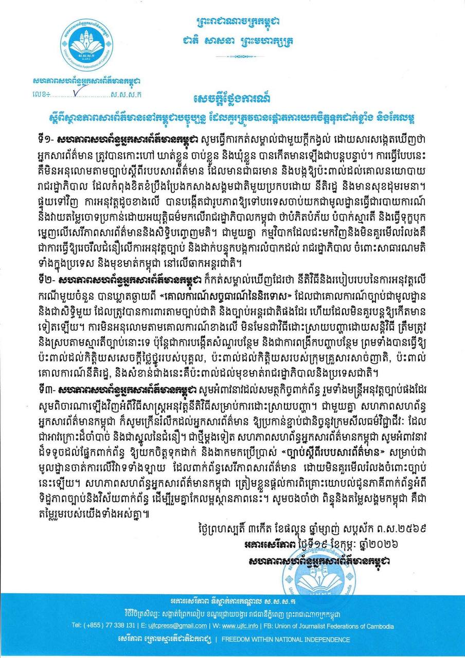 (ភ្នំពេញ)៖ សហភាពសហព័ន្ធអ្នកសារព័ត៌មានកម្ពុជាបានកត់សម្គាល់ជាមួយក្តីកង្វល់ ដោយសារសង្កេតឃើញថា អ្នកសារព័ត៌មាន ត្រូវបានកោះហៅ ឃាត់ខ្លួន ចាប់ខ្លួន និងឃុំខ្លួន បានកើតមានឡើងជាបន្តបន្ទាប់។ ការធ្វើបែបនេះ គឺមិនអនុលោមតាមច្បាប់ស្តីពីរបបសារព័ត៌មាន ដែលមានជាធរមាន និងបង្កឱ្យប៉ះពាល់ដល់គោលនយោបាយ រាជរដ្ឋាភិបាល ដែលកំពុងខិតខំប្រឹងប្រែងកសាងសង្គមជាតិមួយប្រកបដោយ នីតិរដ្ឋ និងមានសុខដុមរមនា។ ផ្ទុយទៅវិញ ការអនុវត្តដូចខាងលើ បានបង្កើតជារូបភាពឱ្យទៅបរទេសចាប់យកជាមូលដ្ឋានធ្វើជារបាយការណ៍ នឹងវាយតម្លៃចោទប្រកាន់ដោយអយុត្តិធម៌មកលើរាជរដ្ឋាភិបាលកម្ពុជា ថាបំភិតបំភ័យ បំបាក់ស្មារតី និងធ្វើទុក្ខបុក ម្នេញលើសេរីភាពសារព័ត៌មាននិងសិទ្ធិបញ្ចេញមតិ។ ជាមួយគ្នា កម្មវិបាកដែលជះមកវិញនិងមិនគួរមើលរំលងគឺ ជាការធ្វើឱ្យរេចរឹលជំនឿលើការអនុវត្តច្បាប់ និងដាក់បន្ទុកបង្កការលំបាកដល់ រាជរដ្ឋាភិបាល ចំពោះសាធារណមតិ ទាំងក្នុងប្រទេស និងមុខមាត់កម្ពុជា នៅលើឆាកអន្តរជាតិ។ នេះបើតាមសេចក្តីថ្លែងការណ៍របស់សហភាពសហព័ន្ធអ្នកសារព័ត៌មានកម្ពុជាដែលអង្គភាពព័ត៌មានទទួលបាននៅថ្ងៃទី១៩​ ខែកុម្ភៈ ឆ្នាំ២០២៦នេះ។