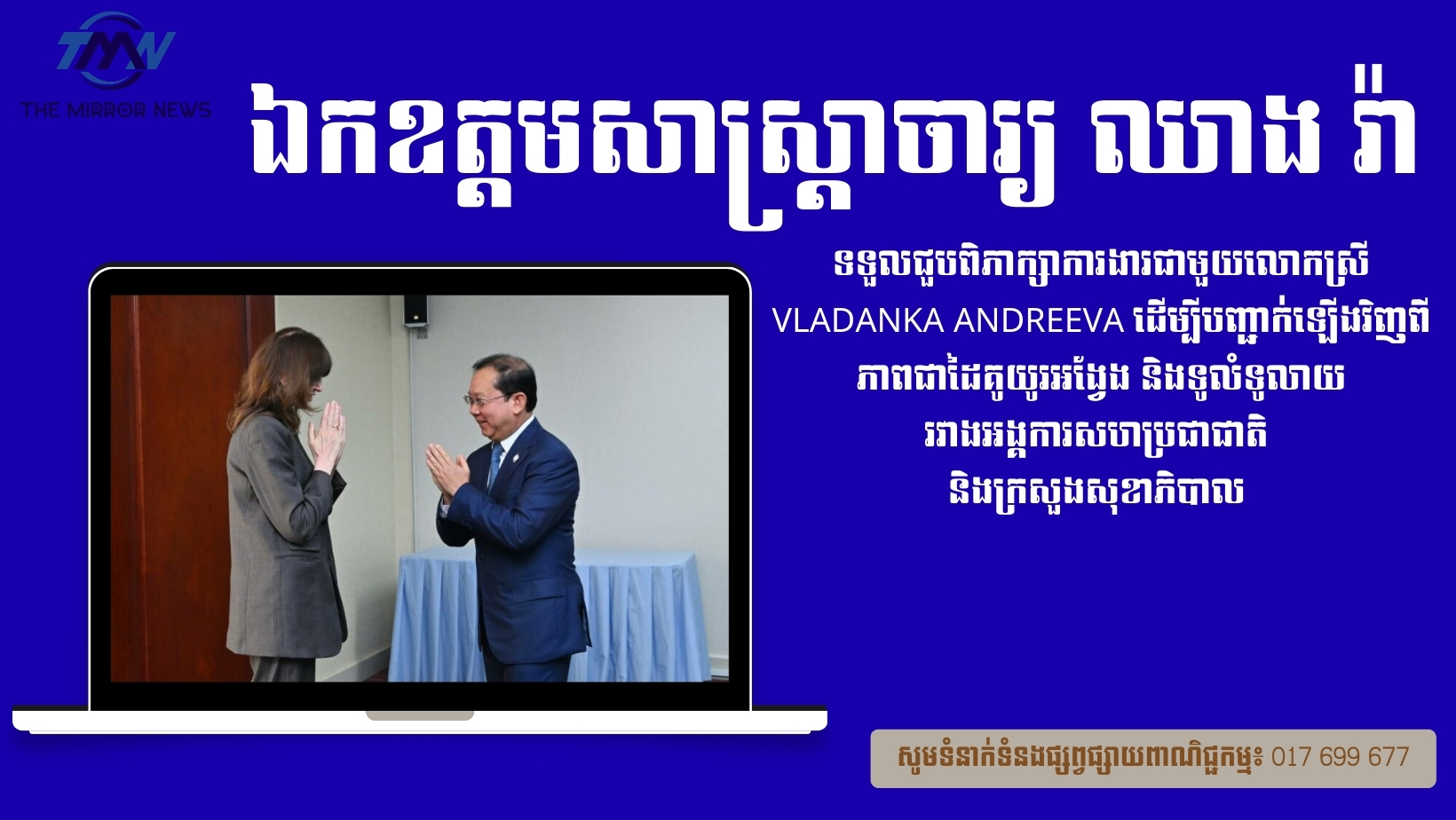 ឯកឧត្តមសាស្ត្រាចារ្យ ឈាង រ៉ា ទទួលជួបពិភាក្សាការងារជាមួយលោកស្រី Vladanka Andreeva ដើម្បីបញ្ជាក់ឡើងវិញពីភាពជាដៃគូយូរអង្វែង និងទូលំទូលាយរវាងអង្គការសហប្រជាជាតិ និងក្រសួងសុខាភិបាល