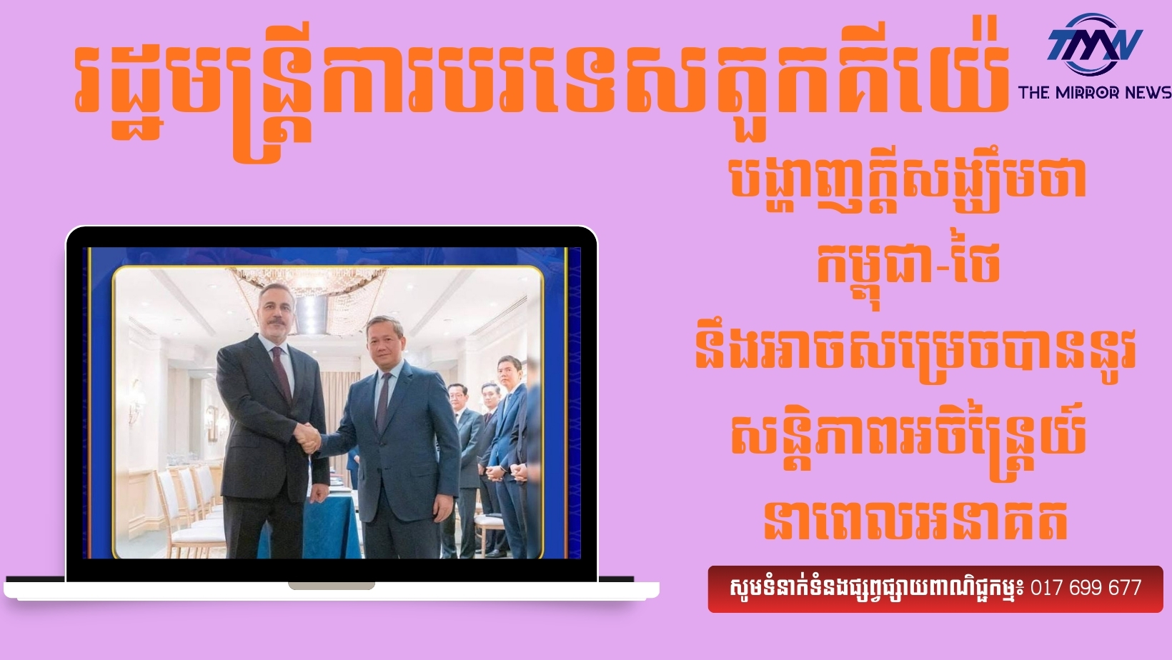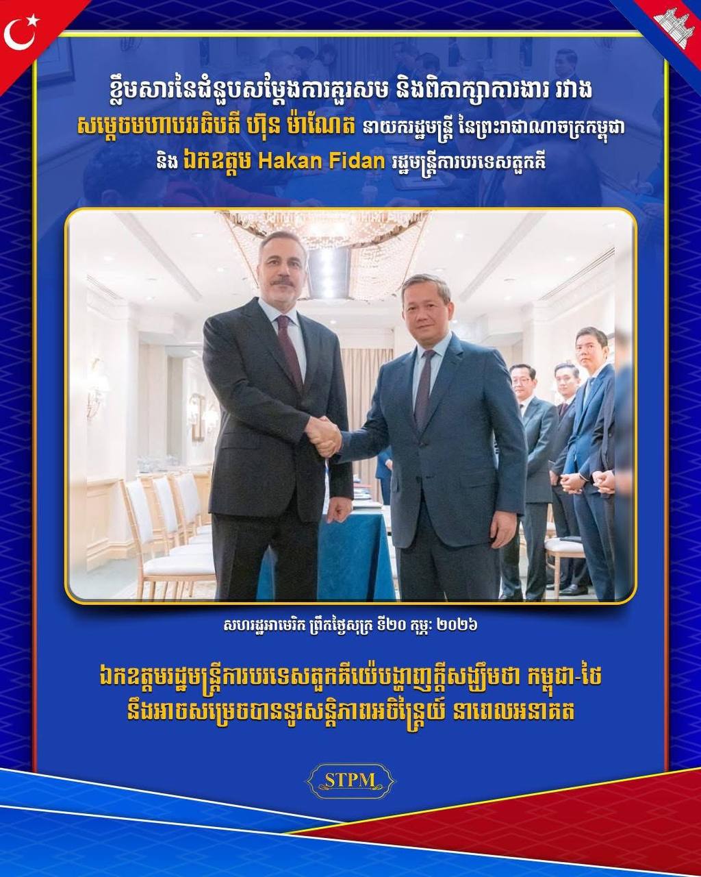 រដ្ឋមន្ត្រីនៃព្រះរាជាណាចក្រកម្ពុជា នាព្រឹកថ្ងៃទី២០ ខែកុម្ភៈ ឆ្នាំ២០២៦នេះ បានអនុញ្ញាឱ្យ ឯកឧត្តម Hakan Fidan រដ្ឋមន្ត្រីការបរទេសតួកគីយ៉េចូលជួបសម្ដែងការគួរសម និងពិភាក្សាការងារ ក្នុងឱកាសនៃការអញ្ជើញដឹកនាំគណៈប្រតិភូជាន់ខ្ពស់រាជរដ្ឋាភិបាលកម្ពុជា ចូលរួមកិច្ចប្រជុំលើកដំបូងនៃក្រុមប្រឹក្សាសន្តិភាព (Board of Peace) នៅរដ្ឋធានីវ៉ាស៊ីនតោន សហរដ្ឋអាម៉េរិក។