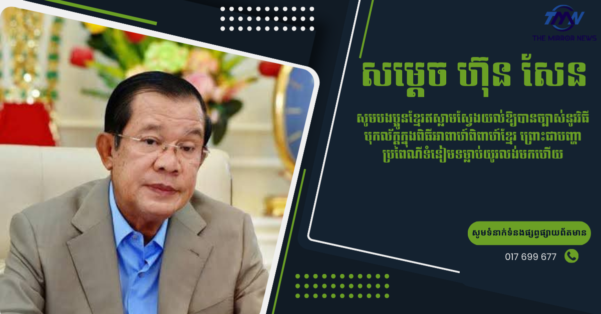 (ភ្នំពេញ)៖ នៅវេលាម៉ោង២ទៀបភ្លឺថ្ងៃ២៤ ខែកុម្ភៈ ឆ្នាំ២០២៦នេះ នៅពេលសម្ដេចបន្តចូលរួមក្នុងកម្មវិធីចម្រៀងគ្រួសារខ្មែរ សម្ដេចបានឃើញការបំភ្លឺរបស់អ្នកនាង ខាត់ សុឃីម និងសេចក្តីអំពាវនាវរបស់ក្រសួងវប្បធម៍វិចិត្រសិល្បៈទាក់ទងដល់វិធីបុកល័ក្ដក្នុងពិធីអាពាហ៍ពិពាហ៍ខ្មែរដែលទាក់ទងដល់បងប្អូនខ្មែរឥស្លាម។ នេះជាប្រសាសន៍របស់សម្ដេចតេជោ ហ៊ុន សែន ដែលអង្គភាព The Mirror News ទទួលបានពីលើបណ្ដាញសង្គមផ្លូវការរបស់សម្ដេចតេជោនាព្រឹកនេះ។